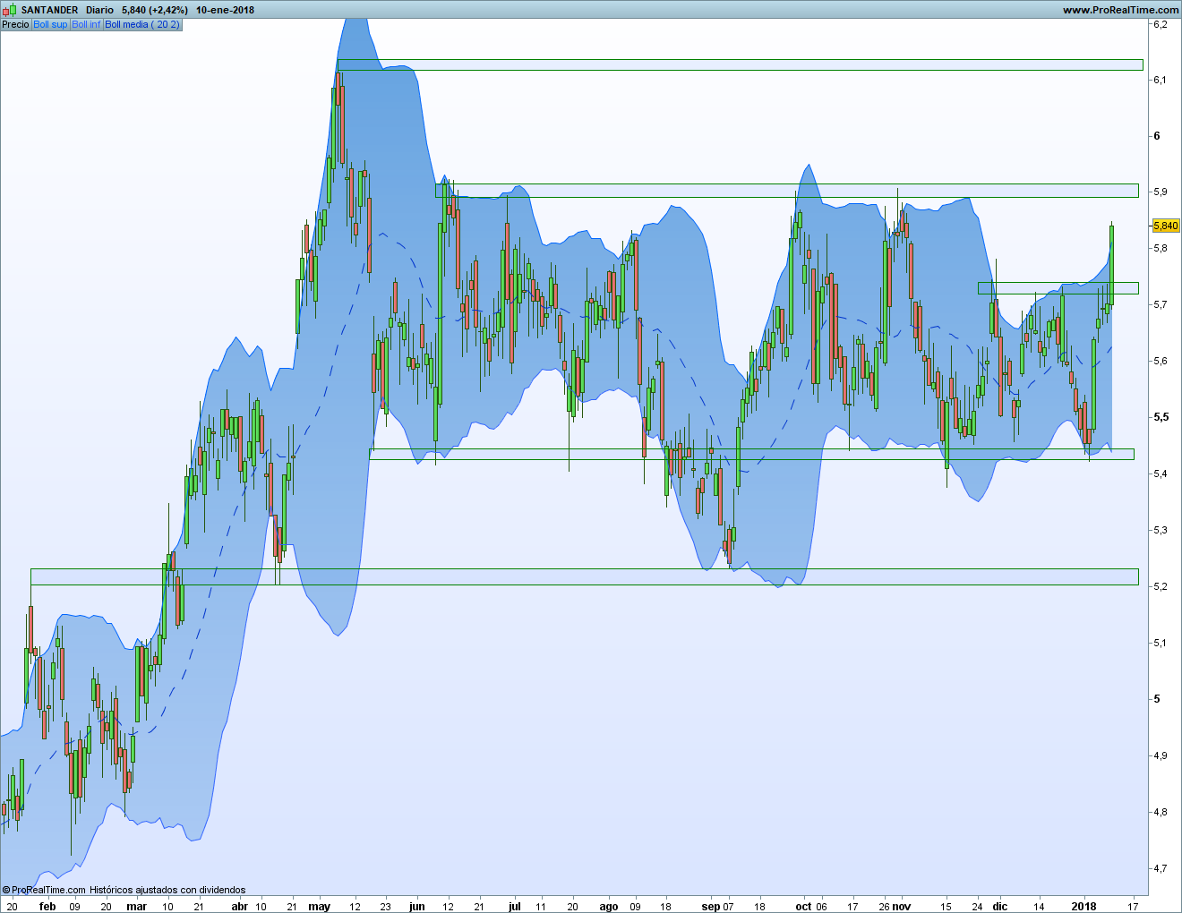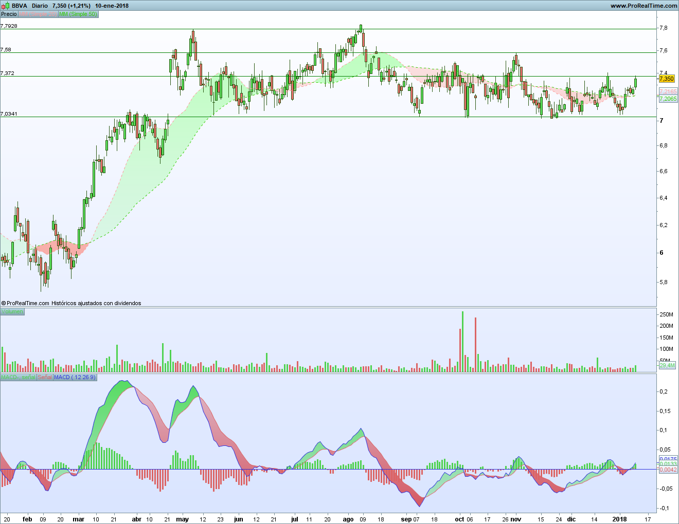 Otro de los que han subido hoy, aunque en menor cuantía que el Santander. Pero aquí el gráfico nos muestra algo muy parecido. Y es que tras la subida de 2016 se está haciendo un lateral muy claro. Y ese lateral sólo puede ser una distribución para marcar un giro bajista o una acumulación para seguir subiendo.
