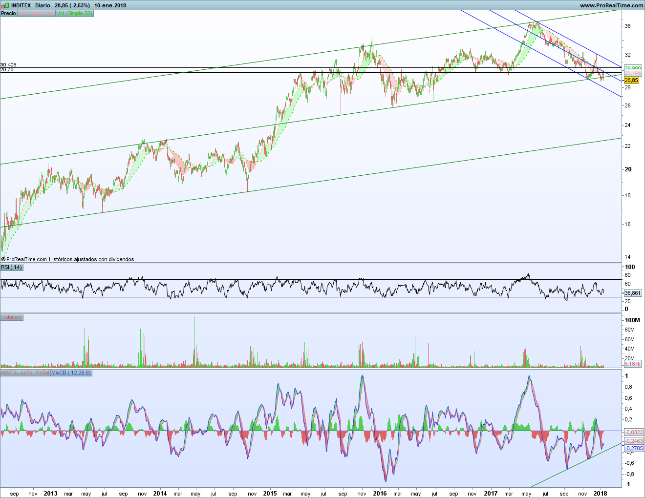 Mientras esta tendencia bajista desde 2017 no finalice, a pesar de ese tridente alcista desde 2013, no podemos pensar que Inditex va a apoyar al Ibex. Veremos si hay o no una señal alcista. De momento no la hay. Encima, a nivel indicadores, tenemos que hoy el MACD deja un fallo, porque parecía que se iba a cortar al alza y se ha ido hacia abajo de nuevo. Veremos si la divergencia alcista que hay aguanta o no.