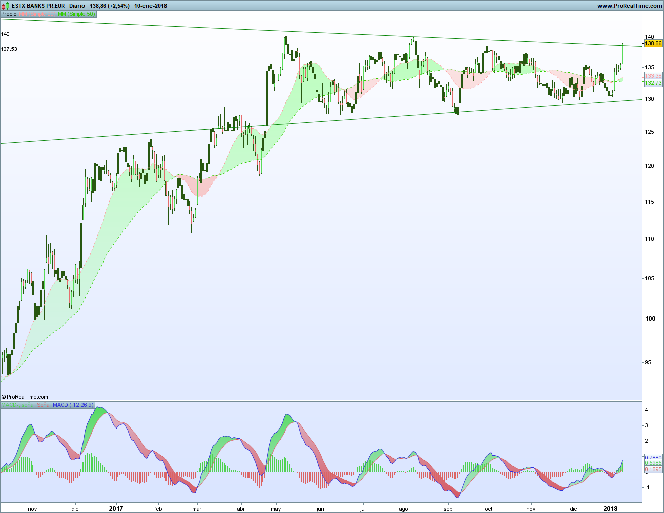 Si la figura se rompe por arriba, entonces hay que fijarse en esa zona del 140 como resistencia. No se anda ya lejos de ella. Y habrá que ver si el sectorial rompe por arriba y va a buscar máximos de 2015 o no.