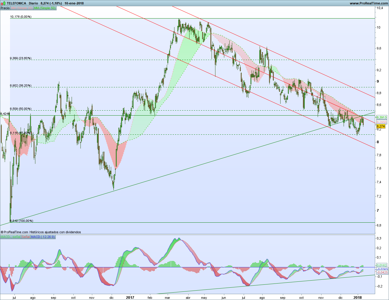 Y todo ello nos deja al valor como estaba. Débil y bajista desde máximo de 2017. Mientras no se rompa esta resistencia, mientras ese tridente bajista siga ahí, no habrá que esperar alegrías por parte de Telefónica. Y todo a pesar de las considerables divergencias alcistas que nos deja el MACD.