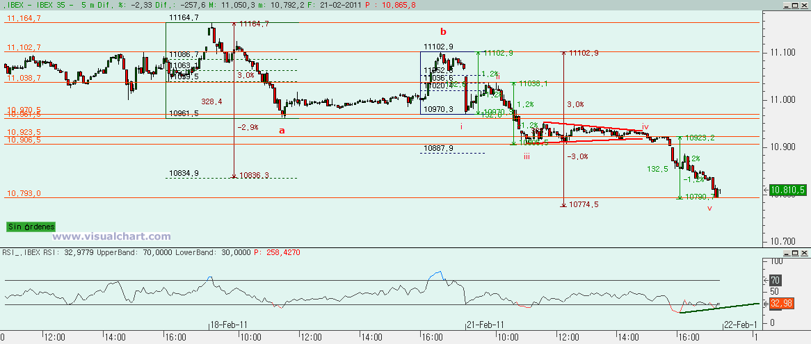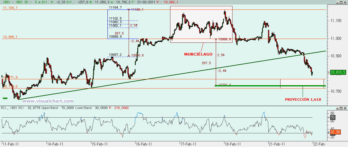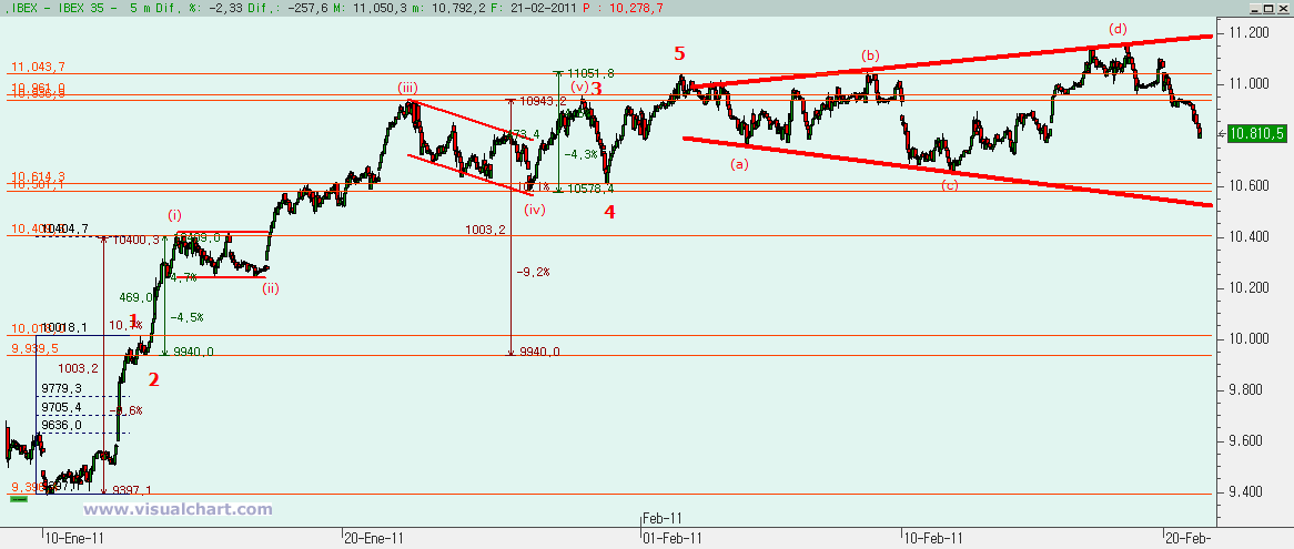 Lunes 21 de Febrero de 2011: Antiguamente se decía que las sesiones en las que Wall Street estaba cerrado eran sesiones con poco volumen, sin sobresaltos y que solían acabar ligeramente en positivo. Últimamente parece que pasa lo contrario, bajamos si no contamos con el apoyo del primo fuerte de la familia. Y es que hoy hemos tenido una sesión con fuertes bajadas aprovechando el cierre de la bolsa de Nueva York. Pero también es algo esperado tal y como terminamos la sesión del viernes. Recordemos los recuentos que dejamos el jueves pasado y las figuras y recuentos que hemos hecho ahora.