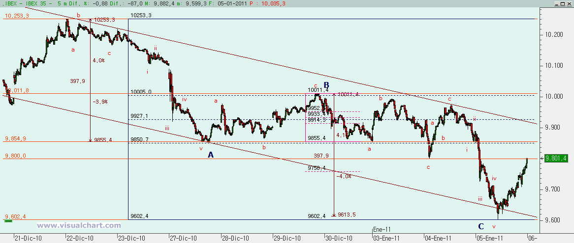 Miércoles 05 de Enero de 2011: Ayer señalábamos en nuestro análisis del Ibex tras el cierre del 4 dos posibles escenarios para el día 5, uno alcista y otro bajista. Y dimos una cota, los 9.912 para ver cuál era el escenario correcto. Si se superaban los 9.912, el alcista era el correcto. Mientras no sucediera eso, había que pensar en el bajista. Y esos 9.912 no se superaron, lo que hizo que bajáramos, incluso con más fuerza de la prevista.