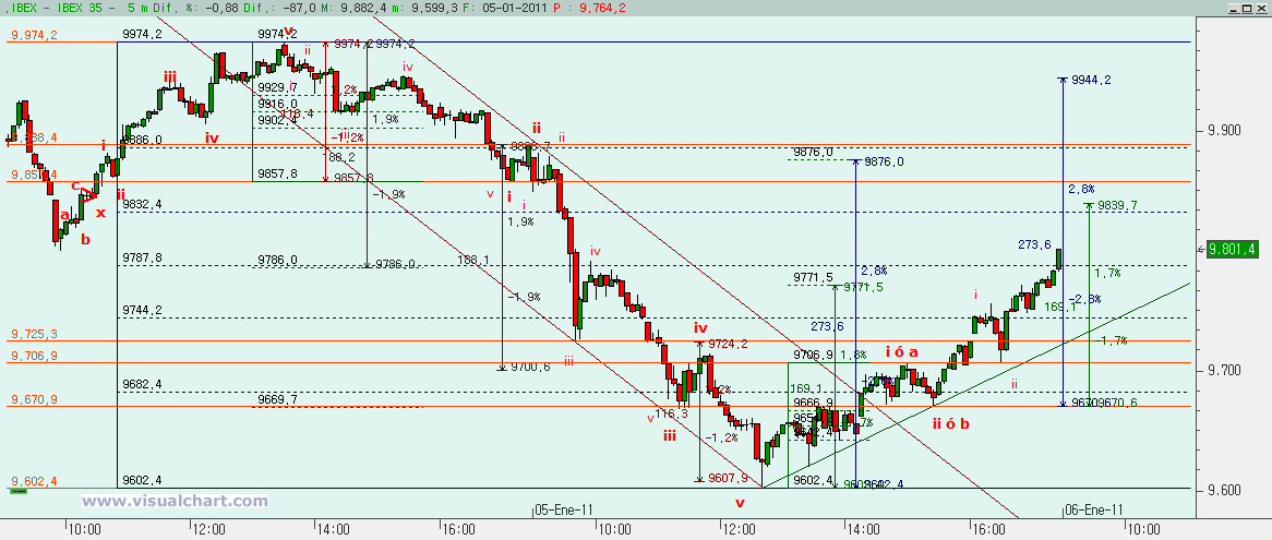 Si miramos el gráfico de cinco minutos de la sesión, nos damos cuenta que desde los máximos del día previo hicimos 5 bajistas hasta los mínimos de la sesión, con la iii un poco menor al 162% de la i y la v igual a la i. Pero tras terminar esas 5 bajistas, debía venir un rebote (aunque con la caída tan severa que llevábamos siempre da miedo ponerse largo), y ese rebote vino en los 9.602, llevándonos 200 puntos arriba.