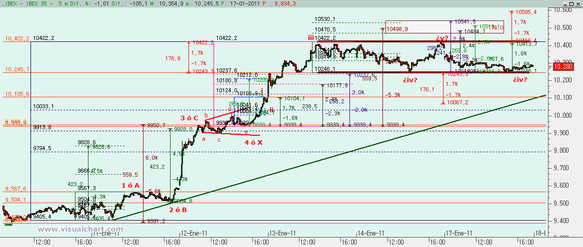 Lunes 17 de Enero de 2011: Hoy, con los mercados americanos cerrado por la celebración del día de Martin Luterto King, hemos tenido una sesión de lo más insulsa, con bajadas pero sin profundizar en ellas. Esto nos ha llevado a formar una especie de rectángulo en el gráfico a muy corto que puede ser o bien una subonda 4 o bien el comienzo de un doble techo que nos indique nuevas caídas. Pero veamos el gráfico de muy corto lo que nos indica.