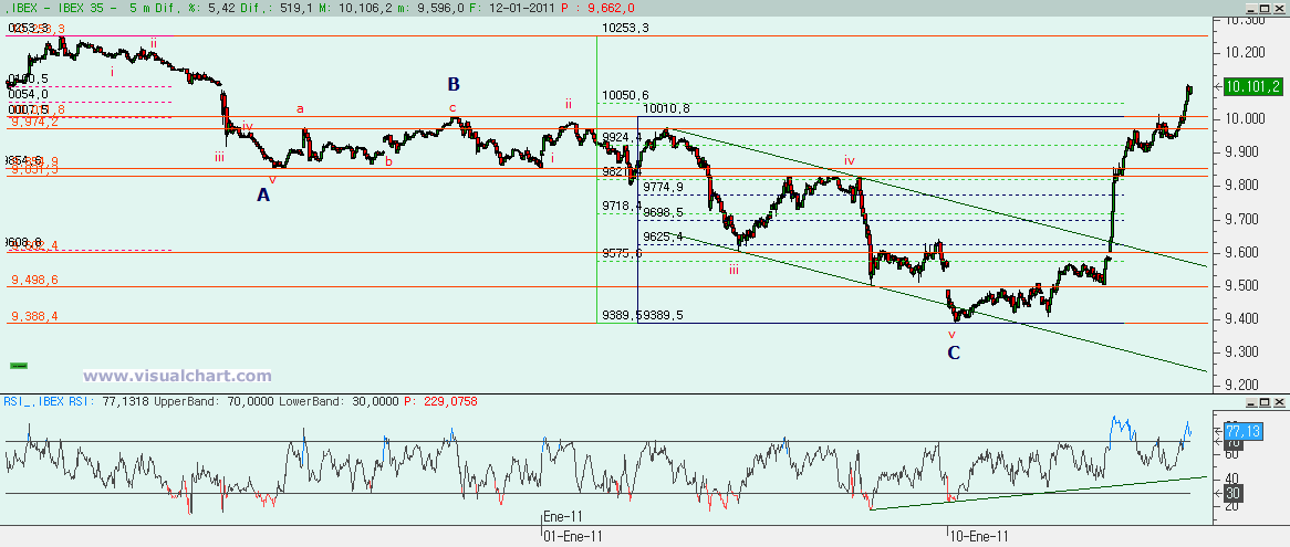 Si miramos el gráfico de corto, desde los mínimos del lunes, podemos ver lo que podrían ser 5 ondas alcistas bastantes claras. La pena es no haberlo visto ayer así porque con una 2 que sólo llegó al 38,2% de la 1, la superación de los máximos de la 1 era una señal de largos clarísima (si es que no estábamos largos desde tocar la alcista desde Marzo de 2009 el lunes), aunque tras el arranque de la mañana tan alcista, pronto lo vimos claro. El caso es que la 3 alcanzó el 262% de la 1, momento en el que abrimos los cortos para intentar conseguir los mismos puntos que la 2, es decir, 64. En realidad bajamos 71, pero más o menos fueron los puntos señalados. La 4 entonces podría haber sido una abc irregular y la 5 empezar en los 9.942.
