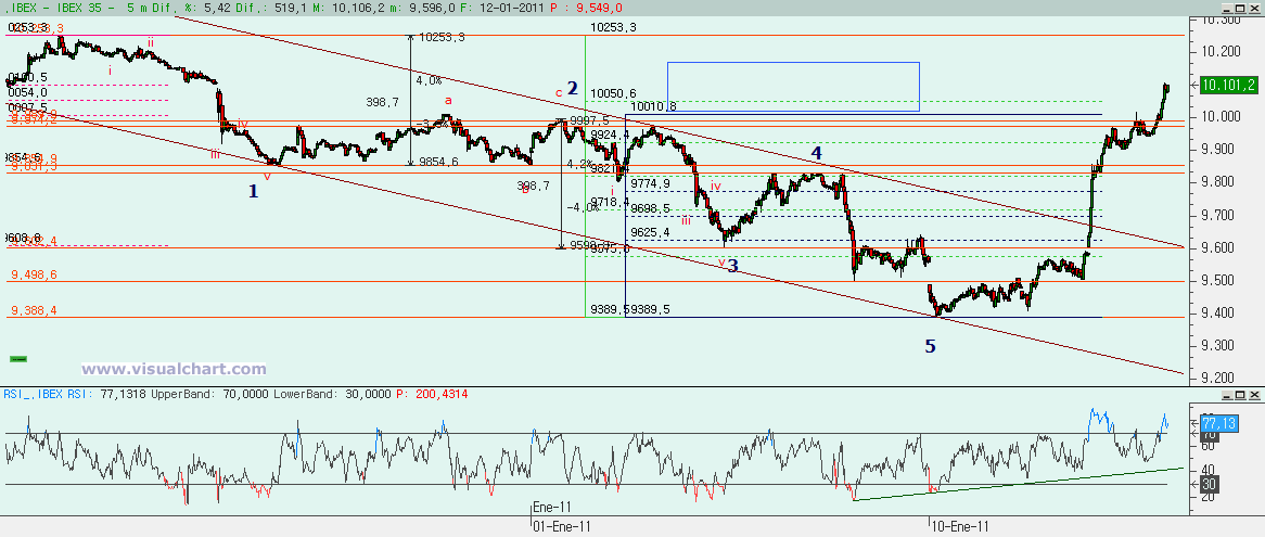 Y ese otro posible recuento desde máximos de Diciembre podría decirnos que hicimos 5 bajistas hasta los mínimos del lunes, con la 3 igual a la 1 y la 5 extendida. Entonces, lo de ahora debería ser solo un rebote. Si así fuera, entonces no se podrían superar los máximos de Diciembre, es decir, los 10.253… Por tanto, ahí tenemos una cota a vigilar por arriba (y no muy lejos) para intentar ver cuál es el escenario correcto… Y como el rebote desde ayer parece haberse formado en 5 ondas, podría ser que la corrección que debería llegar en breve (deberíamos ver una ABC para corregir al menos el 38,2% de la subida), podría ser el anticipo de otras 5 alcistas, pero que fuera más pequeña y que finalizara este rebote en un doble techo, por ejemplo, sin superar los 10.253 (recordemos el objetivo que hemos marcado para la 5 antes). Pero todo esto hay que verlo en las próximas sesiones…. Porque aún no está nada claro, aunque hayamos rebotado en el sitio justo. Pero mientras no superemos los 10.253, no podemos decir que el escenario alcista es el correcto… Y si se superan, entonces activaríamos ese escenario alcista (aunque tengamos correcciones intermedias).