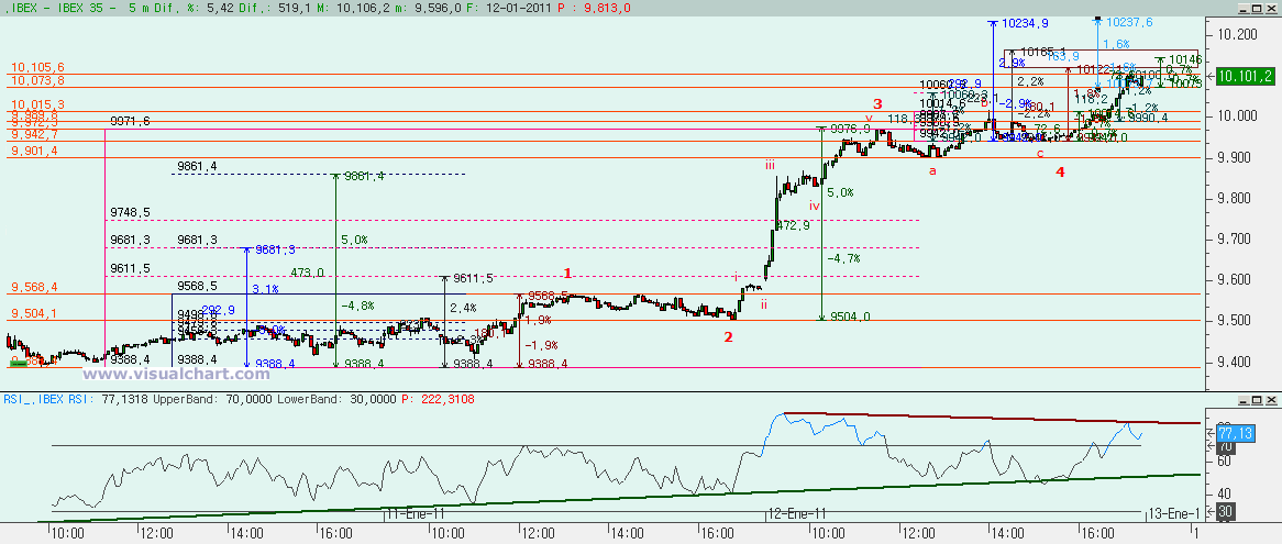 Entonces ahora se trataría de ver hasta dónde puede llegar la 5 para cerrar los largos que podamos tener abiertos e intentar abrir unos cortos para intentar pillar la corrección que debe venir después de 5 ondas alcistas. Así, si la 5 fuera igual a la 1, el objetivo estaría en los 10.122, mientras que si la 5 fuera igual al 38,2% del conjunto 1-3, el objetivo estaría en los 10.165. Si miramos la 5, vemos que podríamos haber formado hoy la i, ii, iii (igual al 162% de la i) y tal vez la iv. Entonces, si la v fuera igual a la i, el objetivo estaría en los 10.146. Por tanto, ya tenemos un primer objetivo para la 5 en la zona de los 10.122-10.165. En este rango lo más prudente sería cerrar los largos (si es que los tenemos abiertos), al menos parte de ellos si es que pensamos que después de la corrección vamos a seguir subiendo, e incluso abrir unos cortos, pero poniendo un stop en esos 10.165 más pequeño filtro. Y si superáramos este rango, ojo que para el siguiente objetivo tenemos una cota: los 10.234, donde coinciden el punto que haría la 5 igual al 162% de la 1 y el que haría la 5 igual al 50% del conjunto 1-3. Y además en los 10.237 tendríamos el punto que haría la v de la 5 igual al conjunto i-iii de la 5… Por tanto, el siguiente objetivo estaría ahí, entre los 10.234-10.237, donde deberíamos intentar los cortos si llegamos.
