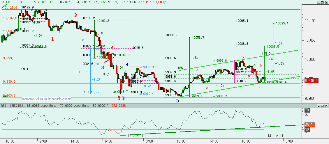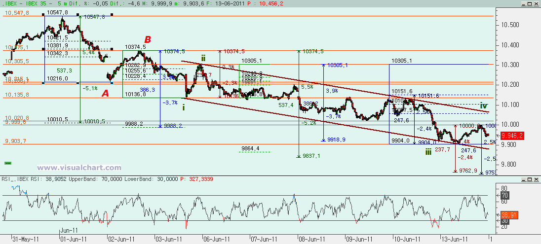 Si miramos el gráfico desde máximos de primero de Junio, vamos a ver si modificamos el recuento y podemos explicar lo que está sucediendo. Y el nuevo recuento nos dice que podríamos haber hecho una A y luego una B que alcanzó el 50% de la A. Y desde entonces podríamos estar haciendo la C en sus 5 subondas bajistas y siguiendo un claro canal bajista. Habríamos hecho dentro de esas 5 bajistas las tres primeras, siendo la iii igual al 162% de la i y el rebote de hoy habría sido la iv. Ahora lo que se trata de ver es si la iv ha terminado hoy o no. Y es que el objetivo para una iv debería estar entre el 38,2% y el 50% de la iii, con lo que la iv debería llegar entre los 10.057 y los 10.104. Pero no podemos descartar que la iv haya terminado en los máximos de hoy y se hubiera hecho en ABC irregular. Si así fuera, entonces el objetivo bajista para una v debería estar entre los 9.753 y los 9.762, pero esto no encajaría mucho con un objetivo bajista de la C igual al 162% de la A que daría un objetivo en los 9.837 (cota que, además, coincidiría con el objetivo bajista del gráfico diario). Entonces tal vez haya que esperar a ver si mañana seguimos con el rebote para seguir con la iv. Pero si perdiéramos los mínimos de hoy antes de alcanzar más altas cotas para la iv, habría que marcarse ese primer objetivo bajista.