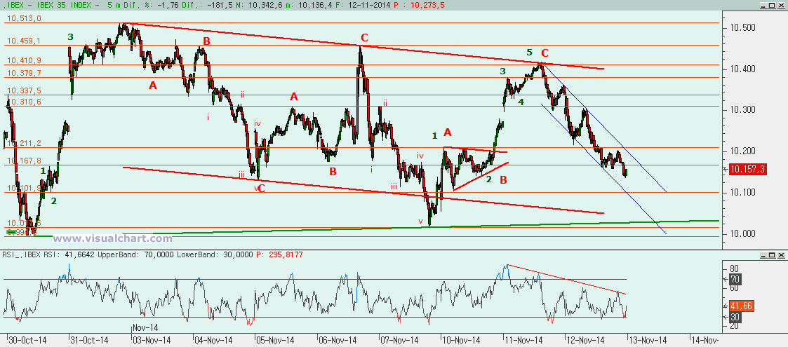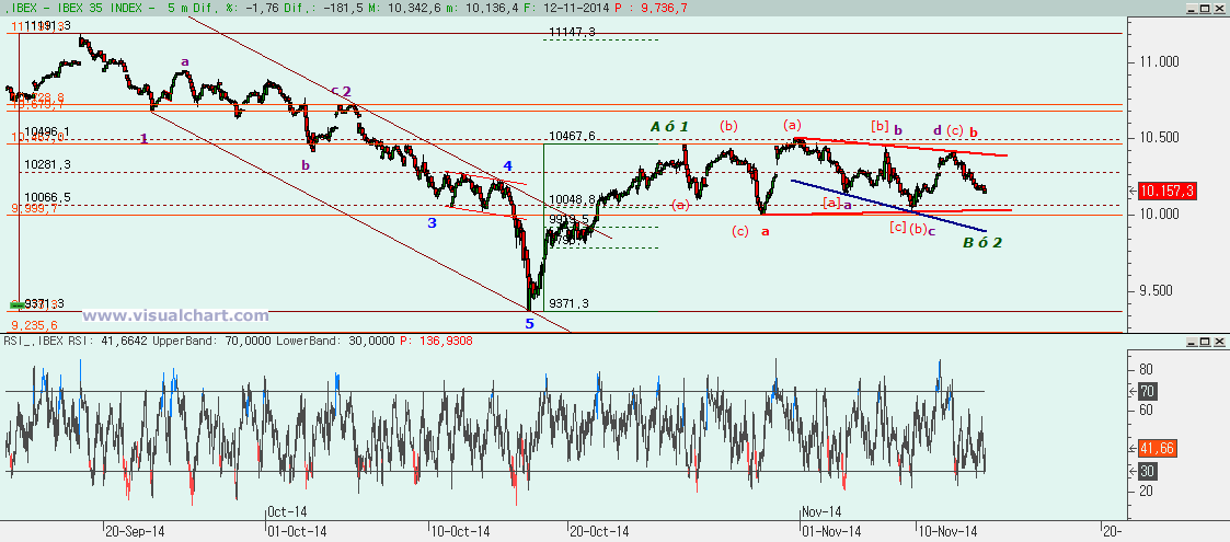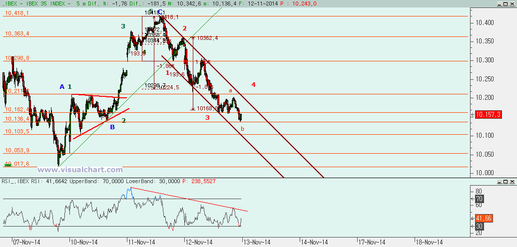 Gráfico desde mínimos del viernes: la subida pudo hacerse en 5 alcistas o ser una ABC. Parece mucho más un ABC, por cómo se ha roto la 0-B verde. Eso implicaba que había que corregir completamente al menos hasta la B y dependiendo de dónde acabara ésta, parece que podríamos haberlo hecho ya. Durante la sesión dijimos que el objetivo podía ser el 10.103, pero parece más factible que la B acabara en el 10.143, por cómo se puede trazar la 0-B. Y el mínimo de hoy ya ha llegado ahí. Por eso podríamos tener ya el objetivo bajista mínimo hecho. Sin embargo, si vemos un posible recuento de al caída, podría ser que hubiéramos hecho una 1 y una 2 bajistas iniciales y luego una 3 igual al 162% de la 1. Y desde ahí estar haciendo una 4 en ABC con la b fuerte, con lo que quedaría una c alcista mañana, posiblemente con gap alcista, para luego hacer una 5 bajista. Pensamos esto y no que se haya hecho ya la 4 y el mínimo de la sesión ser la 5 porque no se podría trazar una 2-4 limpia. Por eso si mañana hacemos esa c alcista de la 4, trazaremos ya la 2-4 y cuando termine la 5 la vigilaremos para confirmar con su ruptura que se habría acabado el impulso bajista. Cuando acabe la 4 el objetivo bajista para la 5 podrían ser entre 120 y 130 puntos abajo al menos en primera instancia.