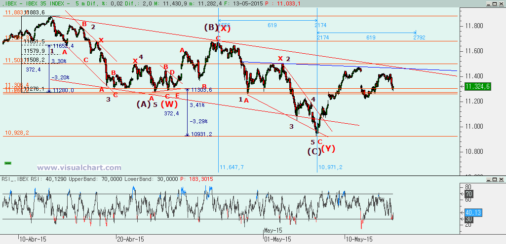 Desde el máximo del lunes parece que ayer hicimos una onda A y hoy hemos hecho una onda B que ha llegado justo al 80% de la caída, lo que parece decirnos que podemos estar en una onda plana, con lo que hoy habría empezado la onda C. Si así fuera, la C debería ir a la zona comprendida entre el 11.142 y el 11.221, es decir, entre el 138 y el 100% de la onda B a menos que estemos en una plana alargada.