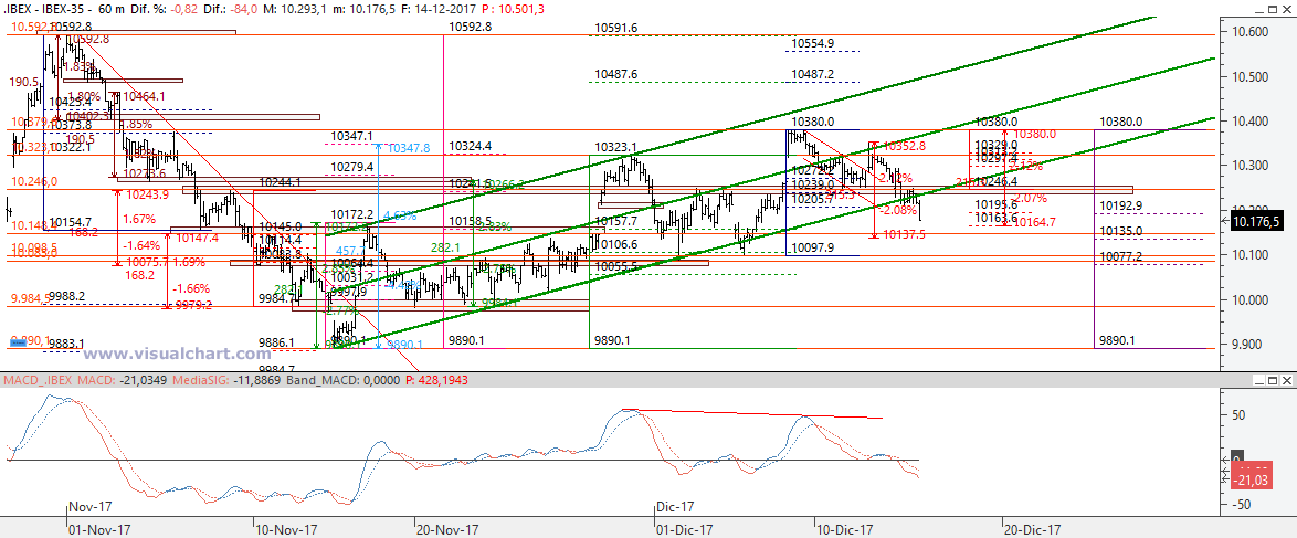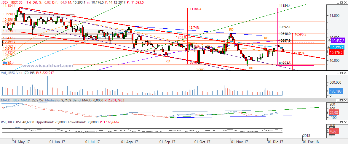 Ibex: Análisis técnico 14 diciembre 2017. Se confirma la debilidad del Ibex tras la señal bajista del viernes. Aquel doji lápida ha resultado ser bueno. Una señal de que la subida o bien había acabado o bien que se tomaba un respiro. Y hoy la caída ya ha llegado al nivel que ayer te comentaba.