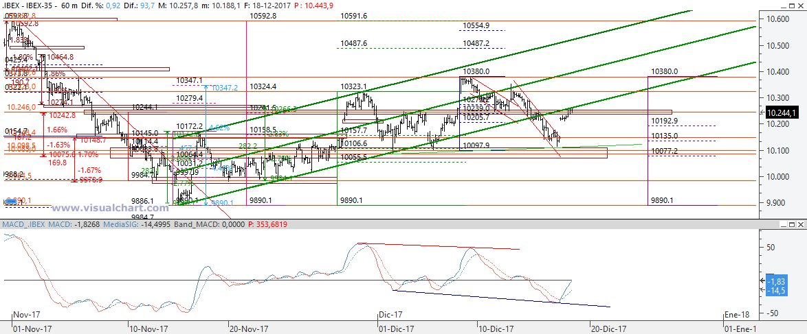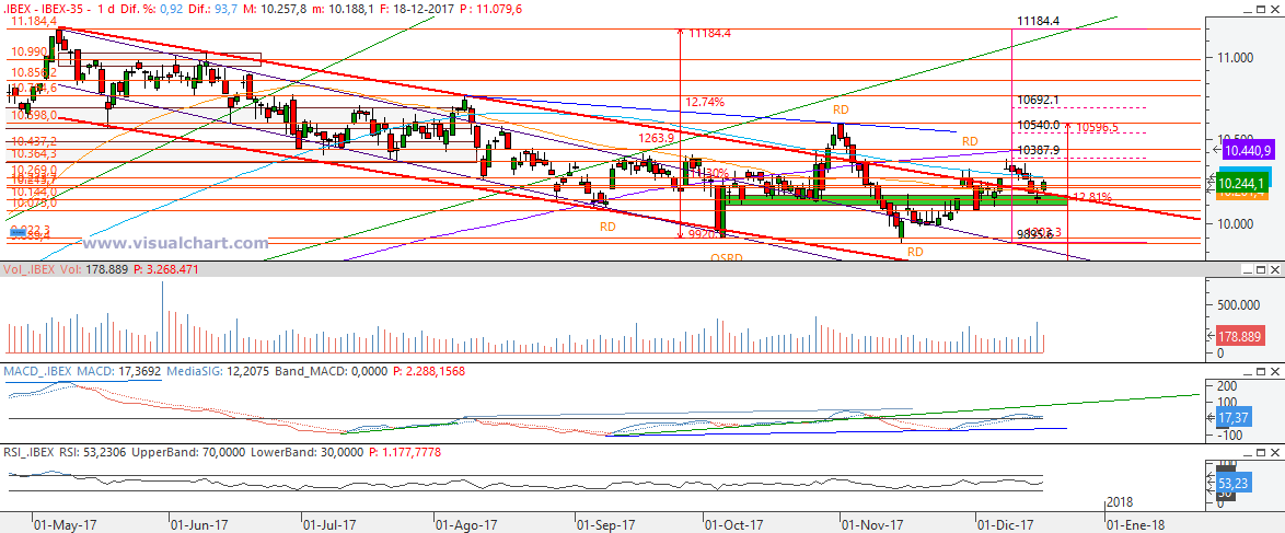 Ibex: Análisis técnico 18 diciembre 2017. Rebote importante en el Ibex para comenzar la semana y todo ello tras pasar la última jornada de vencimientos del año. Todo se ha producido desde la zona de soporte que se tocó el viernes. Y con un gap alcista que hoy no se ha cerrado.