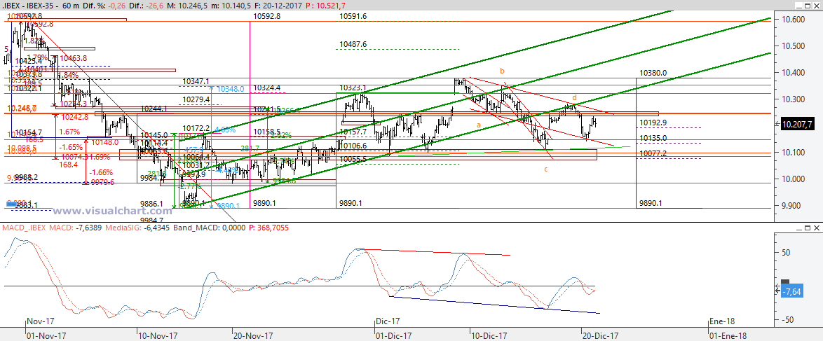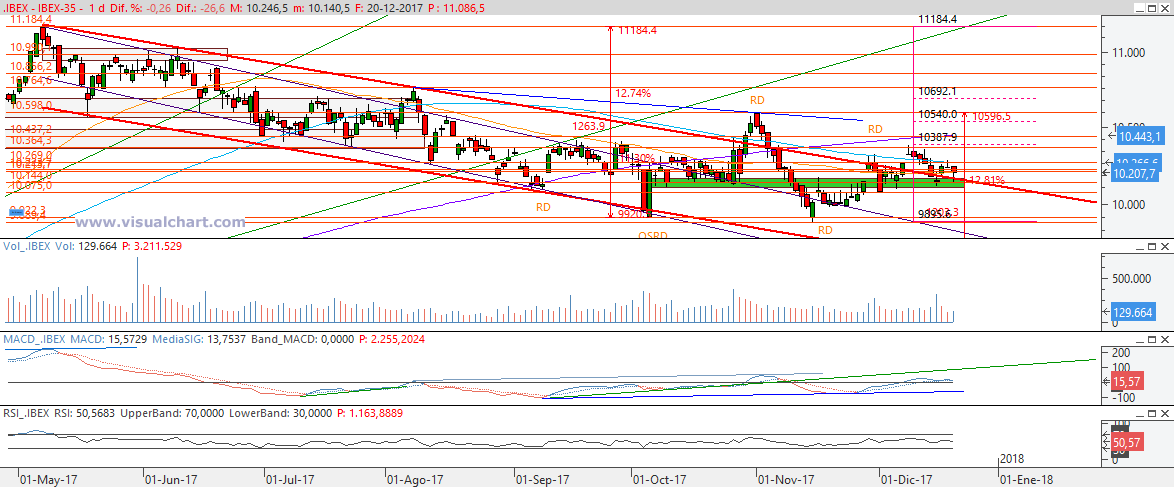 Ibex: Análisis técnico 20 diciembre 2017. Parece increíble, pero el gráfico diario está mandando en el comportamiento del Ibex. Nos manda señales un día y al siguiente las cumple. Y las zonas importantes son las que acaban dando giros.