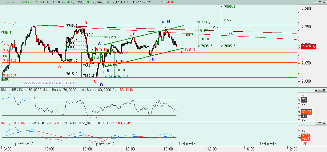 Desde el máximo de ayer parece que hicimos una plana de libro con una primera A, luego una B que corrige entre el 80 y el 100% de la A y luego una C bajista que baja aproximadamente hasta el 138% de la B. Entonces hoy había que ver si rompíamos la bajista 0-B y en menos tiempo del que tardó en formarse la C para ver si teníamos que hacer un nuevo tramo alcista. Pero eso no se ha producido. De hecho, aunque hemos penetrado ligeramente esa bajista hoy para luego caer con fuerza, esa rotura no se ha hecho en menos tiempo del que tardó la C en hacerse, lo que parece indicarnos que estamos en algún tipo de corrección más compleja. Podría ser que fuéramos a hacer un triángulo o algo así. Si nos damos cuenta, la subida de hoy se ha producido en un canal alcista, y eso muy impulsivo no es. Más bien parece una subida correctiva, que podría ser simplemente la formación de una B (si contabilizamos la plana inicial como una A) o bien podría ser parte de un tramo alcista mayor, si es que esa subida en canal alcista hubiera sido una 2 o una B para luego hacer una 3 ó C. Si fuera una C igual a la A, deberíamos hacer otros 70 puntos arriba desde el mínimo de la e (que si hubiera terminado en el mínimo del final de sesión nos daría un 7.765). Y si fuera una 3 igual al 162% de la 1, entonces serían 112 puntos arriba. Aunque también podría ser el recuento azul en el que el máximo de hoy sería ya la B para desde ahí hacer un tramo bajista, que podría ser una C por debajo de la A (mínimo de hoy) o bien una C de un triángulo. Veremos lo que ocurre.