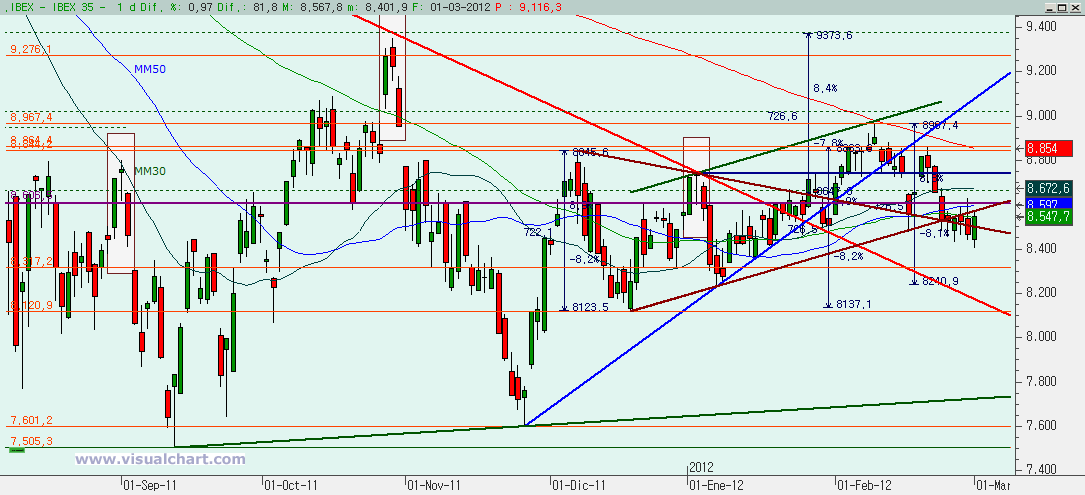 Jueves 01 de Marzo de 2012: Jornada alcista para comenzar el mes de Marzo aunque con comienzo bajista haciendo un nuevo mínimo por debajo del de días pasados. Además, al cierre hemos dejado otro RD, que viene a sumarse al de hace tres días, aunque hoy debería haberse anulado ese por el mínimo de hoy. El caso es que ya sabemos que estas señales solo son buenas si se producen en un objetiv bajista y ese es el objetivo ahora, comprobar si el RD puede ser bueno o no. Vayamos con los gráficos.