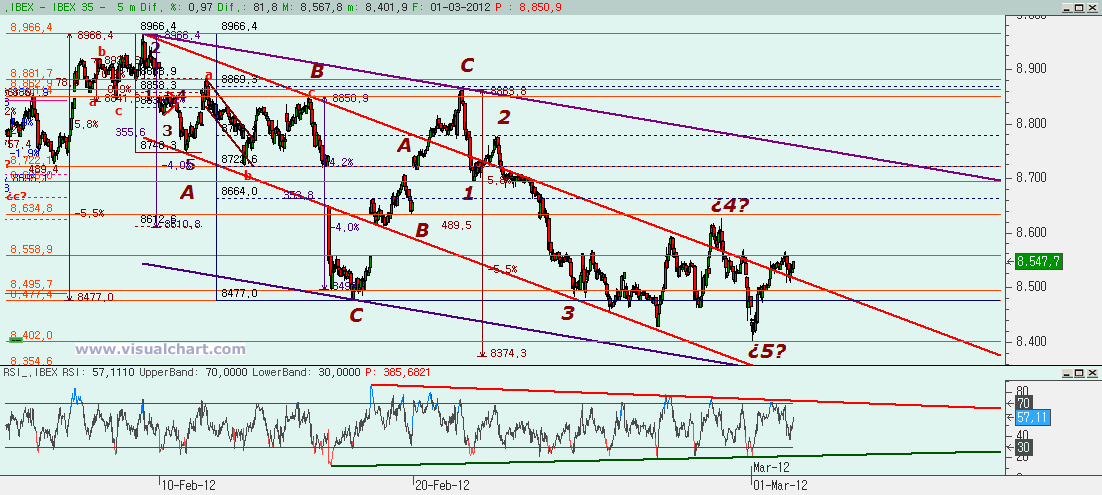 Si miramos la que debería ser la C tenemos la duda de si acabó la 5 o no. Las opciones son tres: la primera es la que ha mostrado ligeia durante el día de hoy. Que el mínimo del día haya sido el final de la 5. Esta opción nos parece la menos probable porque los niveles no acaban de encajar para pensar en él. Pero no la vamos a descartar de momento. La segunda opción es que sigamos en la 4. El mínimo de hoy habría sido la d de un triángulo expansivo para hacer la 4 y ahora este rebote sería la e. Esta e no tendría por qué irse a la parte alta del triángulo expansivo y más bien podríamos decir que no debería superar el máximo de la c, porque ya dijimos que una 4 no debería ir por encima del 8.630 que era el 50% de la 3. Aunque mientras que no se supere el 8.696 no se confirmaría del todo que no es una 4, si superamos el 8.630 deberíamos suponer que no es una 4. La tercera opción es que la 5 terminara el día 27 y desde entonces estemos haciendo un rebote a esas 5 bajistas y el mínimo de hoy hubiera sido la B de una ABC con B fuerte. Entonces quedaría hacer la C alcista.