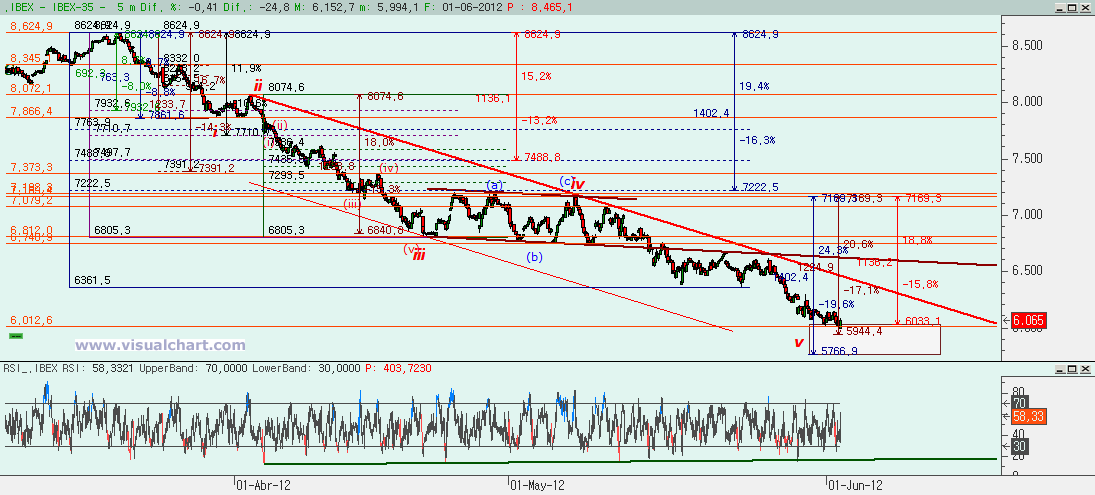 Domingo 03 de Junio de 2012: Cierre el viernes de nuevo en las inmediaciones del 6.000 y ya habiendo hecho incluso un mínimo intradía por debajo de esa psicológica cota. Estamos en la parte baja de los canales bajistas de medio plazo y no somos capaces de articular ni un rebote importante, y eso es muy mala señal. Y más cuando el resto de índices parecen haberse decidido también a bajar. Veremos si en estos niveles puede llegar ese rebote o si rompemos por abajo y hay que volver a ponerse el paracaídas…