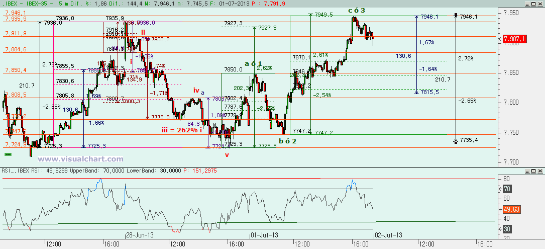 Gráfico desde el máximo del viernes: habíamos señalado 5 bajistas completas y desde ahí rebote. Pero ha llegado por encima del origen de esas 5 bajistas, por lo que no era el inicio de un impulso bajista, a menos que hubiera sido el final de una onda bajista en fallo. Pero eso no vamos a considerarlo por el momento. Entonces desde el mínimo del viernes hemos hecho o bien un abc con la c igual al 162% de la a o 3 de 5 alcistas con esa 3 igual al 162% de la 1. Ahora se trata de ver si hacemos una 4 o si confirmamos el abc para bajar en otras 5 ondas. Si perdemos el 7.850 se confirma el abc y podríamos ir abajo mínimo al 7.815 para ser igual al 61,8% de las 5 bajistas iniciales y al 7.715 para ser igual a esas 5 bajistas. Si son 5 alcistas, entonces habría que intentar encajar las piezas de otro modo, tal vez pensando que la caída del viernes no fueron 5 bajistas y esta subida de ahora es el segundo tramo alcista desde mínimos de la semana pasada.