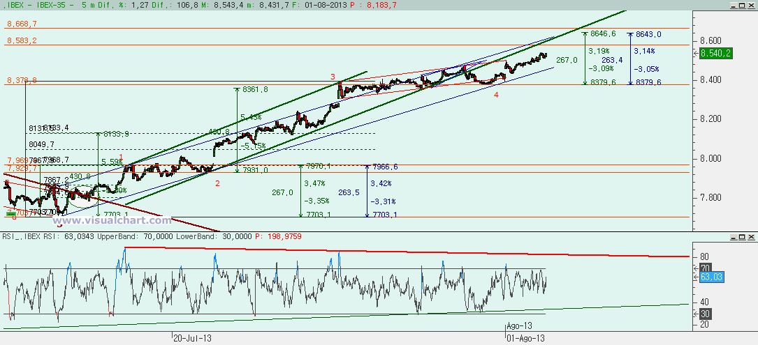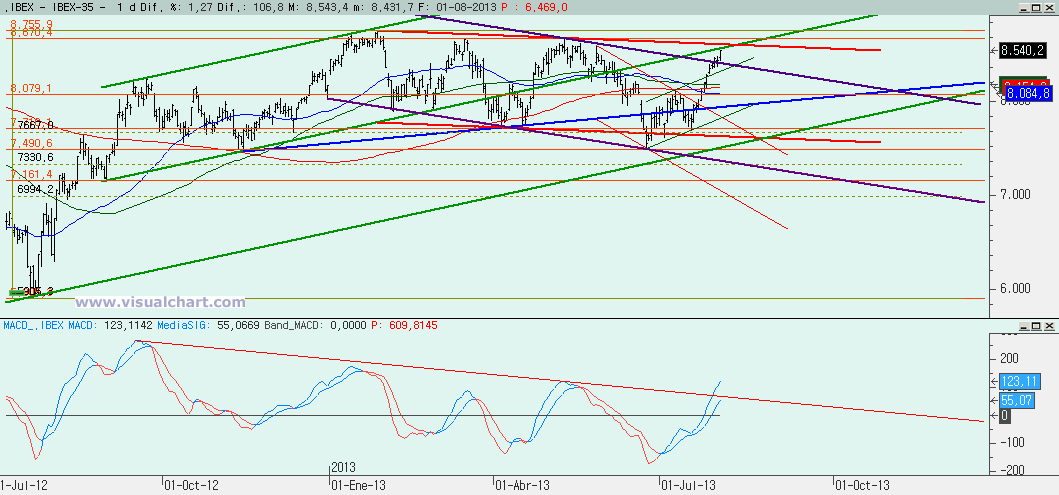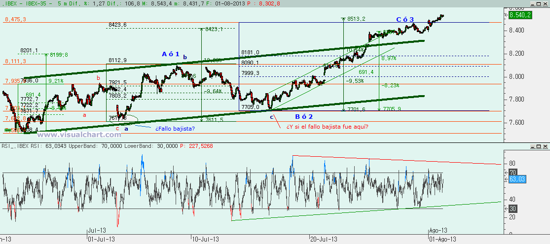Gráfico desde mínimos de junio: habíamos puesto un recuento con un fallo bajista en el mínimo de comienzos de mes y que nos daba un ABC o 5 alcistas con la C ó 3 igual al 162% de la A ó 1 en el 8.515. Hoy hemos superado esa cota, y aunque podríamos estar en el filtro aún para pensar en que el recuento puede ser bueno, la verdad es que parece que no debe haber relación entre las ondas señaladas y podría ser que el fallo bajista se produjera el día 17 de julio, justo cuando en diario tenemos el fallo del MACD. Entonces habría que recontar ondas desde el 17 y no intentar ajustar nada desde antes. Pero lo que parece claro es que al haber fallo el 17 hay que retroceder el movimiento bajista al completo, con lo que habría que visitar el 8.670.