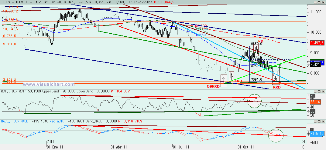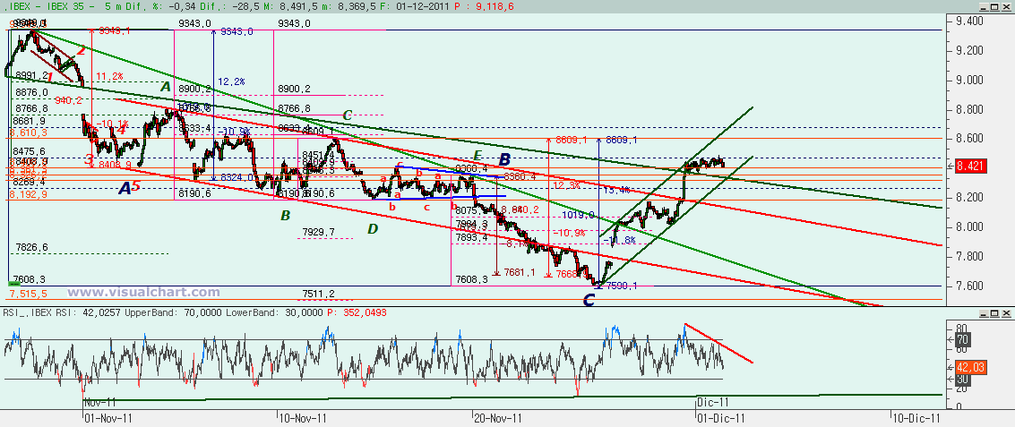 Jueves 01 de Diciembre de 2011: Jornada aburrida de transición en el Ibex en el día de hoy para comenzar el mes de diciembre. Como hemos dicho muchas veces, cuando una semana se presenta muy alcista desde el lunes es complicado ver recortes durante el resto de la semana y así lo estamos comprobando también en ésta. La subida ha sido importante y hay que consolidar, pero a pesar de eso no se corrige casi nada. Anoche señalamos que parecía que teníamos que subir algo más. Lo que hemos hecho hoy invita a lo mismo, a que quede algo más por arriba, pero veamos los gráficos.
