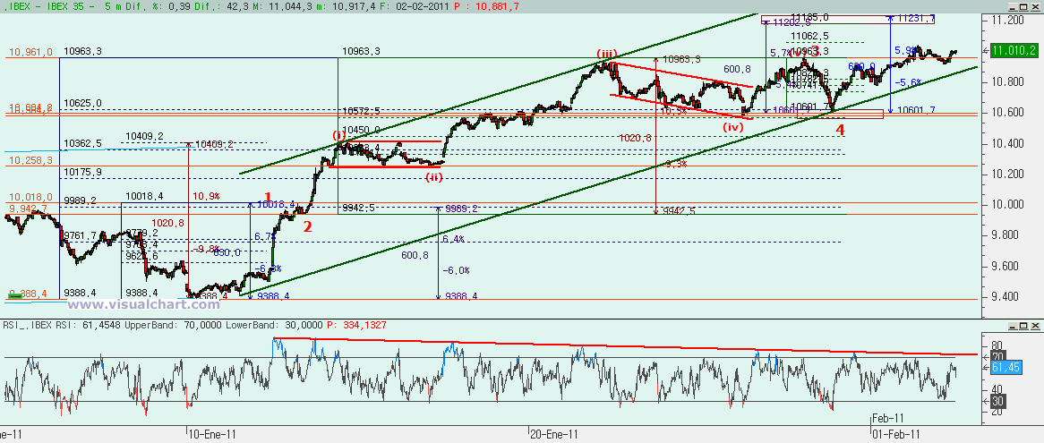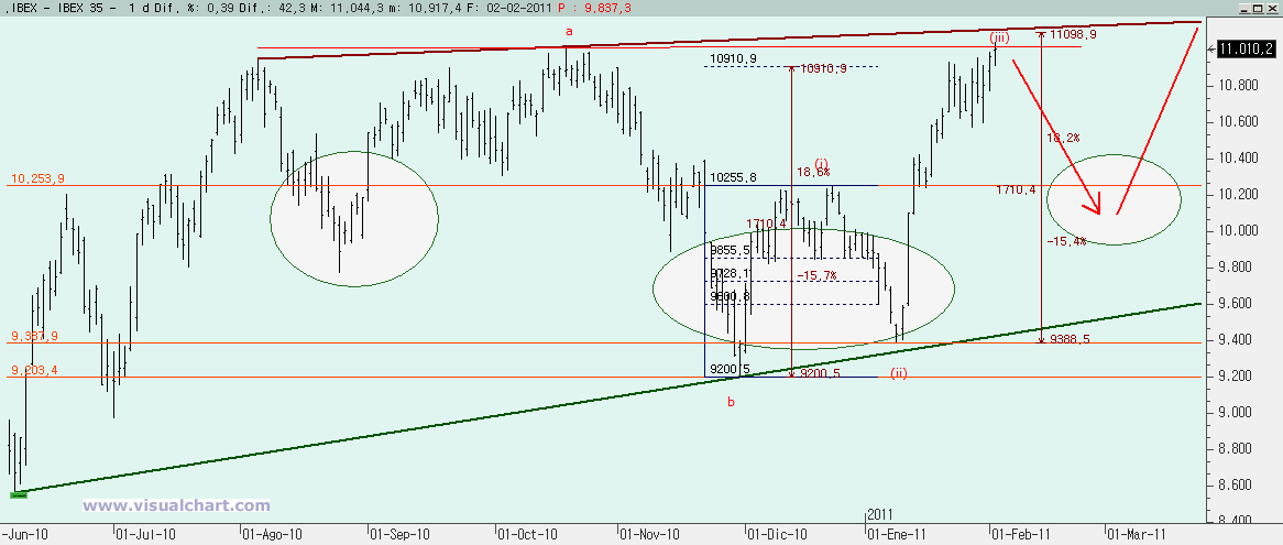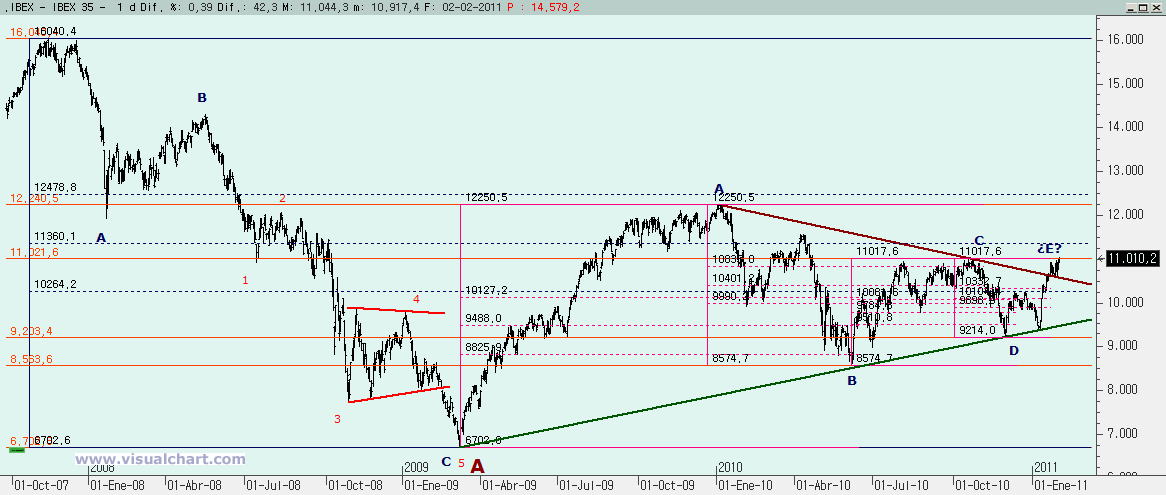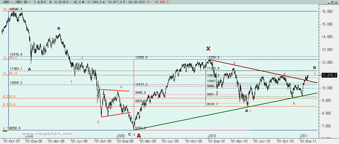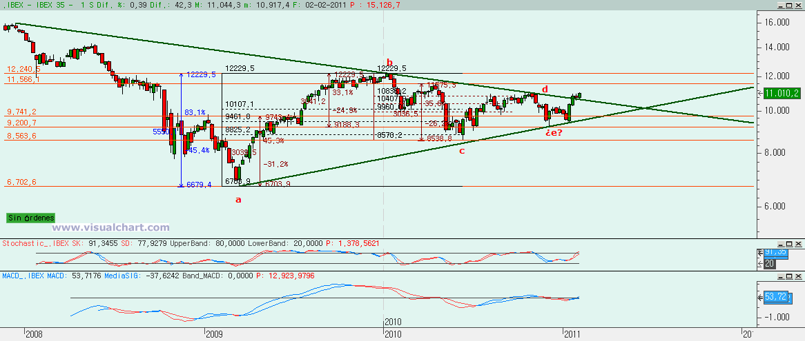 Miércoles 02 de Febrero de 2011: Durante estos últimos días hemos venido hablando de la batalla entre alcistas y bajistas por definir el escenario de medio y largo plazo. Habíamos presentado dos escenarios principales, uno por cada bando y teníamos unas cotas y directrices claras que marcaban cuándo uno de los dos escenarios caía. Por abajo tocamos la directriz crítica en los mínimos de Enero. Por arriba teníamos los 11.020 como barrera para anular el escenario bajista. Pues bien, hoy hemos estado por encima de esa cota, aunque hemos cerrado ligeramente por debajo. ¿Podemos dar por muerto el escenario bajista? Veamos lo que nos dicen los gráficos.