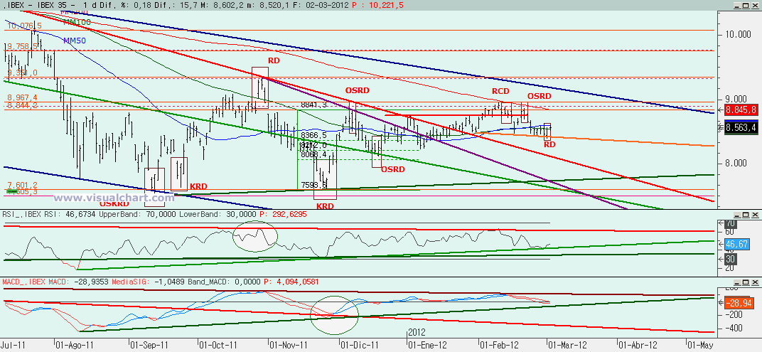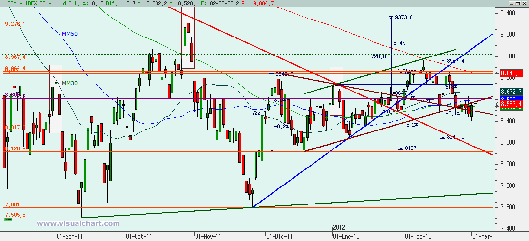 Domingo 04 de Marzo de 2012: Jornada para terminar la semana en la que se alcanzó el nivel señalado en el artículo del jueves (el 8.601) y ahí tuvimos una pequeña corrección para al final cerrar casi planos. Esto nos hace tener todas las dudas del mundo para ver cuál es el escenario correcto de los que señalamos días atrás. Vayamos con los gráficos y con las distintas opciones.