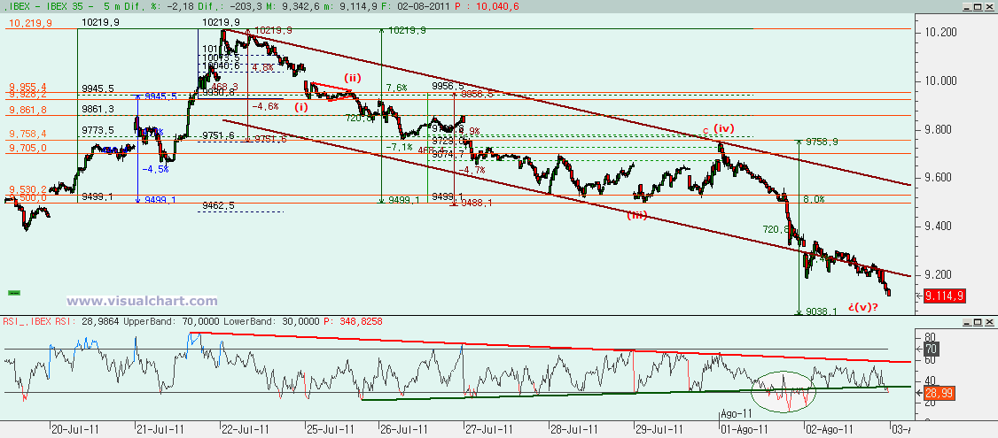 Mañana debemos estar atentos, pues, a varias cotas. La primera esos 9.037, pero como parece que ya de inicio podríamos perderla, luego el objetivo es ver qué pasa en los 8.977 que es el siguiente soporte diario y, si la perdemos, atentos a un posible giro antes de los 8.718. Si giramos antes de esa cota y rompemos el canal bajista, mucho ojo a una posible señal de giro en gráfico diario. Si además superamos los 9.282 sin perder esos 8.718 podría confirmarse que habríamos terminado 5 bajistas. Y es que, además, el RSI nos habría hecho un mínimo en la iii de la 3, dando luego divergencias alcistas… Es decir, lo normal en un impulso de 5 ondas… Por ello, mañana tendremos un día de lo más interesante… Si perdemos los 8.718, al hoyo. Si nos quedamos antes y superamos los 9.282, podríamos tener un rebote mayor, pero ya intentaríamos ver el objetivo después. Lo primero es ver hasta dónde llegamos y si podemos ver una señal de giro…