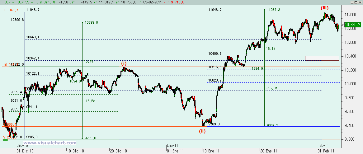 Si pensamos que hemos terminado la (iii) y que esto que ha comenzado es la (iv), entonces no deberíamos ir más abajo de los 10.253 (y si vamos más abajo sería muy mala señal para los alcistas). De hecho, el objetivo podría estar entre los 10.342-10.409 ( zona del 38,2% del conjunto (i)-(iii) y el 38,2% de la (iii)), aunque incluso podía ser menor.