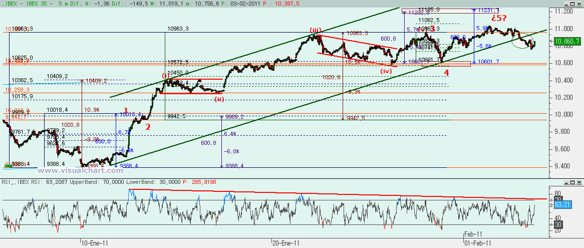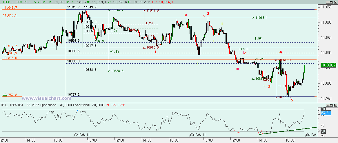Si hacemos un zoom desde los máximos de ayer, vemos como podríamos haber hecho 5 ondas bajistas. La 3 habría sido casi igual al 162% de la 1 y la 5 igual a la 1. Las divergencias alcistas que hemos visto hoy desde la 3 también lo confirmarían. Ahora entonces debería formarse un rebote en forma de ABC para luego bajar otra vez (puesto que sabemos que tras 5 bajistas iniciales deben venir otras 5 tras la ABC). El objetivo para esta ABC debería estar, al menos, en el 50% de la caída, es decir, hasta los 10.900, aunque lo normal sería irnos hasta el 61,8% o incluso algo más. Si no llegáramos a los 10.900 y perdiéramos los mínimos de hoy sería una señal bajista. Pero también hay otra posibilidad, y es que esto fuera parte de la 4del gráfico anterior, de modo que fuera una 4 en ABC irregular… Por ello, debemos tener presente que si superamos los máximos de ayer podría ser la señal de que esto habría sido una 4 y hubiéramos empezado la 5. Pero si mañaba hacemos la ABC alcista y volvemos a bajar, entonces deberíamos pensar en algo más de caída.