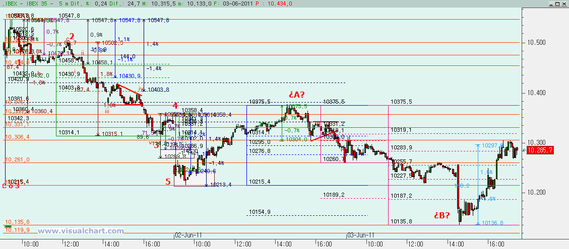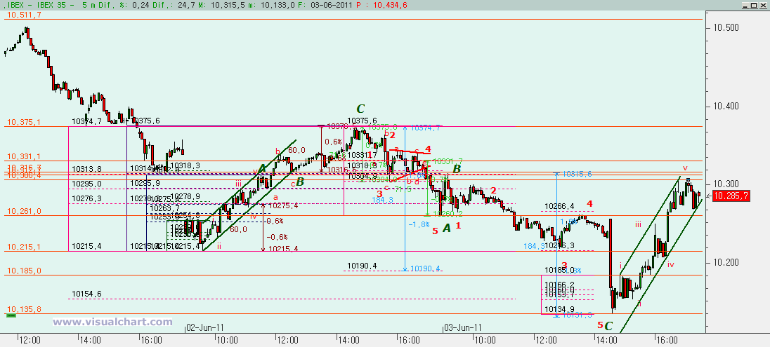 Pero hagamos otro zoom para ver si esta posible ABC irregular se está haciendo en un conjunto de 3-3-5 ondas. Si así lo hacemos, nos damos cuenta de que la A se hizo en ABC con la C igual al 61,8% de la A, la B también se hizo en ABC con la C igual al 162% de la A y ahora se trata de ver si la posible C se ha hecho o se está haciendo en 5 ondas. Si miramos lo sucedido desde mínimos, podríamos haber hecho 5 ondas, con la 5 igual a la 3, pero nos gustaría tener un recuento más limpio y más normal para 5 ondas. El caso es que si rompiéramos a la baja el canal alcista que hemos marcado, entonces habría que pensar en la posibilidad de que hayamos terminado esta ABC irregular y que haya que volver a bajar a por los mínimos de Mayo, al menos. Si así fuera, entonces los 10.306, máximos del final de sesión serían la cota que nos diría que no hemos terminado la ABC irregular si se superara. Además, puesto que hemos dicho que en caso de ser una ABC irregular lo normal es que hubiera fallo de irregular, entonces los 10.375 serían la siguiente cota que nos diría que esta opción de ABC irregular no debe ser la correcta. Por tanto, por arriba ya tenemos las cotas que nos anularían este escenario. Por abajo, la pérdida del mínimo del Viernes nos anunciaría la visita, al menos, a los mínimos de Mayo, y tal vez algo menos. Entre medias de estas cotas lo que hay que hacer es vigilar las formas de las ondas, para ver si estamos corrigiendo o si estamos haciendo un movimiento en 5 ondas.