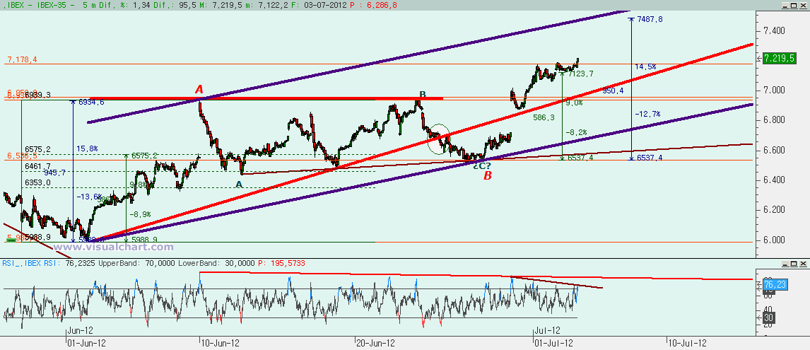 Martes 03 de Julio de 2012: Pues continúan las subidas en el Ibex que no muestra señales aún de corregir ante esta subida desde mínimos anuales. Muchas veces hemos dicho que estos rebotes suelen darse sin dar tregua y sin dejar entrar a los que se han quedado fuera. Y parece que esta es una de esas veces. Todo parece indicar ahora que podríamos llegar a la zona del 7.500, tal vez algo más abajo. Pero hay que evaluar si no podríamos ir incluso más arriba. Veamos los gráficos.