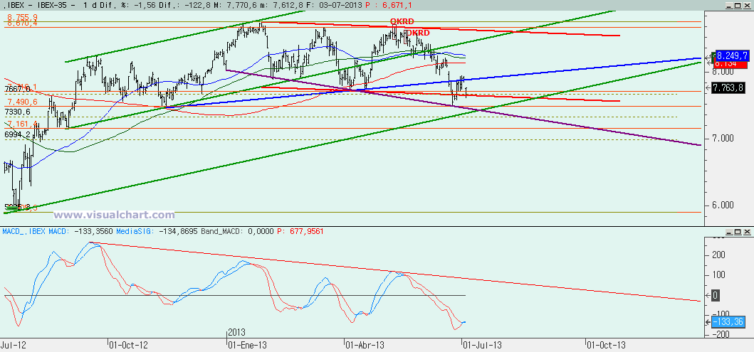 Gráfico diario: volvemos por debajo de la alcista azul y con gap bajista. Ya hemos dicho que había que vigilar si el rebote había sido un pull-back a esa alcista rota, y ahora mismo así lo parece, aunque el MACD esté cortado al alza. Hay que esperar a ver si el MACD sigue cortado al alza o se gira de nuevo a la baja para darnos un nuevo tramo bajista e irnos a ver qué ocurre en la alcista verde y en la bajista morada que en unos pocos días coinciden.