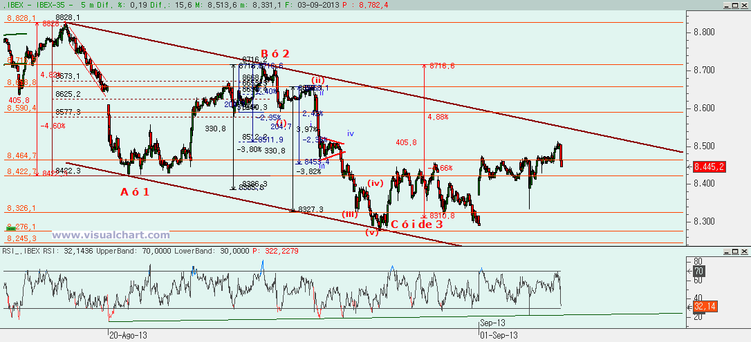 Gráfico desde mínimos de la semana pasada: ayer señalamos que habíamos hecho un ABC alcista con la C igual a la A. Pues bien, desde ese máximo de ayer hemos vuelto a hacer otro ABC bajista que ha corregido algo más del 61,8% de la subida del ABC inicial. Esto podría significar que el ABC inicial ha sido una A, pero el segundo parece demasiado corto en el tiempo para ser una B. Más bien parecería una a de esa B, pero eso implicaría que la b sería fuerte y quedaría la c bajista que podría haberse comenzado hoy. Pero hay algo que no acaba de encajar, con lo que lo mejor es ver lo que ocurre mañana y ver cómo van encajando las piezas… Y es que sin la caída final podría incluso que el recuento fuera desde la primera B azul una 1 y una 2, pero esa caída parece decir que no lo es. Mañana lo veremos. De momento podríamos pensar en que podríamos hacer mañana una C bajista de modo que terminemos una B global para luego subir a la parte alta del canal bajista. Pero ya hemos dicho que vamos a ver lo que pasa.