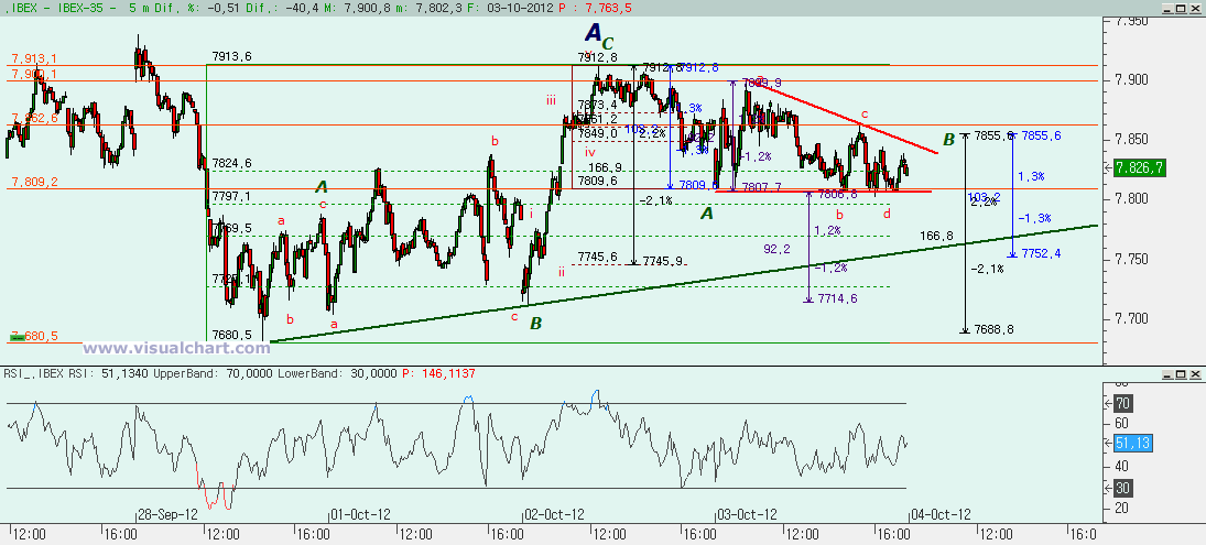 Miércoles 03 de Octubre de 2012: Jornada aburrida y correctiva en el Ibex hoy tras las dos últimas subidas tal y como pensábamos anoche. La subida de los dos últimos días parecía solo una A, con lo que deberíamos tener una B que consumiera tiempo. Y hoy hemos estado consumiendo tiempo, aunque sin corregir tampoco demasiado formando un pequeño triángulo. Esto nos hace entender que mañana deberíamos corregir algo más antes de que pudiéramos tener el segundo tramo alcista que pensábamos debíamos tener. Vayamos con los gráficos.
