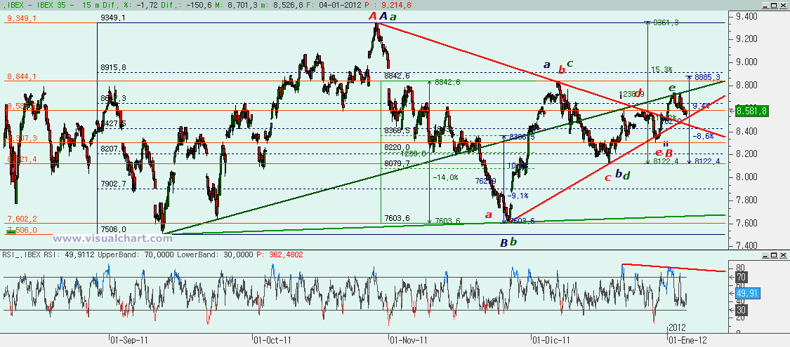 Si miramos el gráfico desde mínimos de septiembre, ayer mostrábamos dos posibles recuentos uno con un triángulo para hacer luego un tramo alcista (en rojo) y otro con una ABC en la que estaríamos en la c de la C. Pero ambos recuentos coincidian en que debíamos estar haciendo ahora 5 alcistas y parece cualquier cosa menos 5 alcistas lo que tenemos. Ambos recuentos se anularían perdiendo los 8.307, aunque el azul se podría descartar incluso antes si se rompe la alcista desde mínimos de noviembre. Pero en verde hemos puesto el recuento alternativo bajista, con un triángulo que estaría a punto de terminar (si es que no ha terminado ya). Habríamos hecho ya la e del triángulo o estaríamos a punto. Y esta e, aunque por encima de la parte alta del triángulo estaría por debajo de la c, es decir, de los 8.844, lo que lo hace perfectamente posible. Eso sí, si se superara ese 8.844 se anularía esta opción.