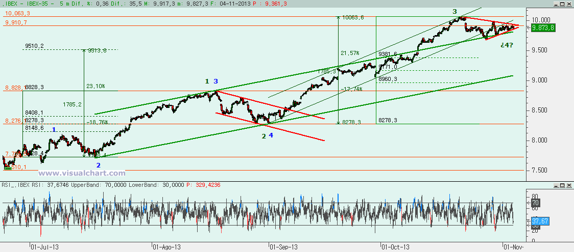 Gráfico desde mínimos de junio: seguimos a la espera de ver si esto es una 4 tras haber hecho una 3 igual al 162% de la 1 desde el mínimo del 17 de julio. Habíamos dicho que si esto fuera una 4 debería consumir más tiempo y eso estamos haciendo, consumiendo tiempo. Parece que se está haciendo un triángulo, pero cuando no se rompe estando tan cerca del vértice lo normal es que la figura no sea buena y que la 4 deba hacerse de otro modo, puede que en forma de onda plana, pero eso lo iremos viendo. Lo que está claro es que en el máximo de hace dos semanas acabamos algo tras romper el canal alcista acelerado y que la caída se ha frenado al llegar a la parte alta del canal alcista que se seguía antes de hacer el acelerado. Es decir, que todo parece encajar en una 4. Hay que recordar que una 4 no debería ir más abajo del 9.171-9.381.