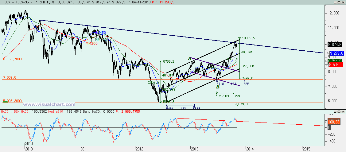 Gráfico diario: mientras no rompamos la bajista desde 2010 no seguiremos con la senda alcista que nos marca el tridente alcista. Pero de momento tampoco hay fuerzas como para ir a por la parte central del tridente ni a buscar apoyo a la MM50. Se trata ahora de ver qué hace el MACD, si en la bajista rebota y todo ha sido un throw-back o si sigue hacia abajo y tenemos una corrección mayor.