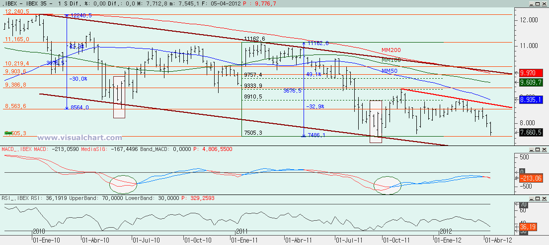 Lunes 09 de Abril de 2012: Tras el parón por la Semana Santa volvemos con el análisis diario del Ibex. El jueves volvimos a hacer un nuevo mínimo por debajo de los de sesiones precedentes, llegando a la zona de mínimos de septiembre (aunque sin tocar ese mínimo) para al final de sesión rebotar y cerrar planos. La vela diaria en forma de martillo en zona de soporte podía anunciarnos un giro, pero hay que tener cuidado, como vamos a ver a continuación. Vayamos con los gráficos.