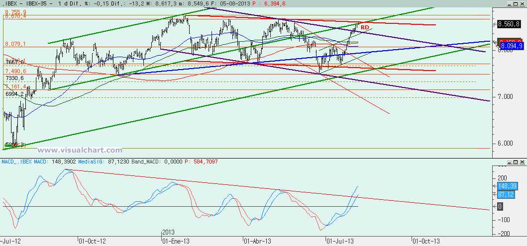 Gráfico diario: ahora sí, ahora sí que estamos justo en la bajista roja y casi en la alcista verde. Es la hora de la verdad y el MACD dando señales de que puede hacer un máximo porque parece que quiere suavizar la subida. Y a todo esto, la señal de hoy, aunque no demasiado clara, es otro Reversal Day. Ya vimos que el último no funcionó, pero el que se haya producido justo aquí es significativo, y el stop de cortos está muy claro en el máximo de hoy más ligero filtro. Eso no quiere decir que vayamos a tener un giro radical, podría ser que este RD solo signifiquen 200 puntos abajo, pero la señal está ahí.