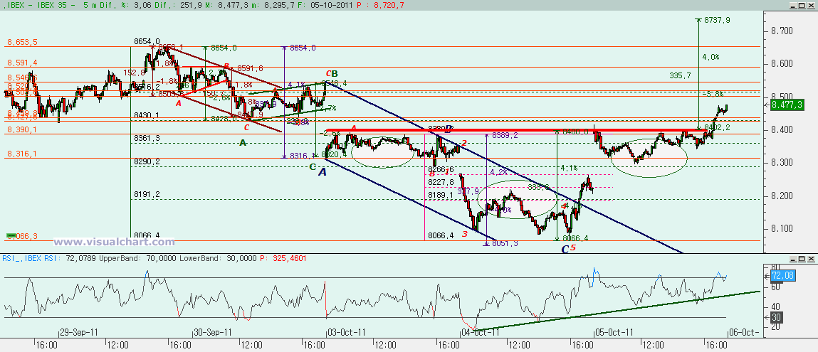 Si ahora hacemos un zoom desde mínimos de ayer para ver el recuento podemos tener dos opciones. La primera es que estemos haciendo 5 alcistas. Así habríamos hecho una 3 igual al 262% de la 1 y hoy una 4 en triángulo. Entonces la 5 habría comenzado al final de la sesión y tendríamos un objetivo alcista inicial entre los 8.475 y los 8.504. Entre esas cotas tenemos el retroceso del 162% de la 4, la cota que haría la 5 igual a la 1 y la que haría la 5 igual al 38,2% del conjunto 1-3. Si se supera ese rango el siguiente estaría entre los 8.540 y los 8.588. Ahí estaría la cota que haría la 5 igual al 162% de la 1 y la que haría la 5 igual al 50% del conjunto 1-3 y la que haría la 5 igual al 61,8% del conjunto 1-3. Sin embargo, podría haber otra opción y es haber hecho una ABC inicial con la C igual a la A que habría formado lo que sería una A. Luego una B en triángulo y después podría venir una C que si fuera igual a la A nos daría un objetivo en los 8.723 que coincide además con el objetivo del HCHi señalado antes.