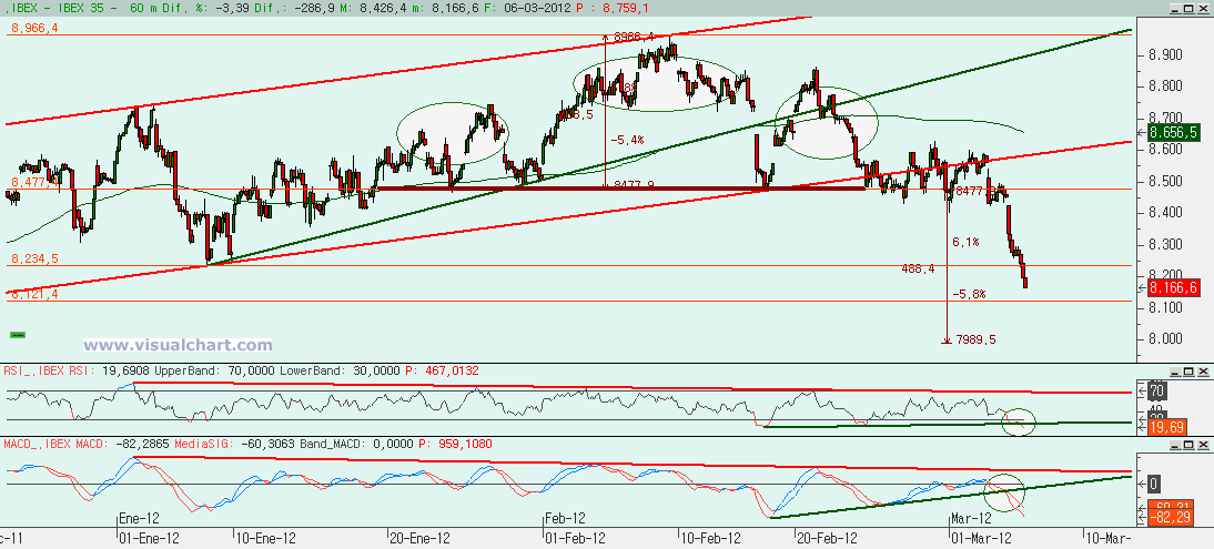 El gráfico horario que nos mostraba el HCH días atrás nos muestra ahora como hemos roto con claridad la clavicular de dicho HCH y que el objetivo bajista mínimo para ese HCH era el 7.989. Y también vemos como hemos roto las alcistas del RSI y MACD que nos mostraban unas ficticias divergencias alcistas.