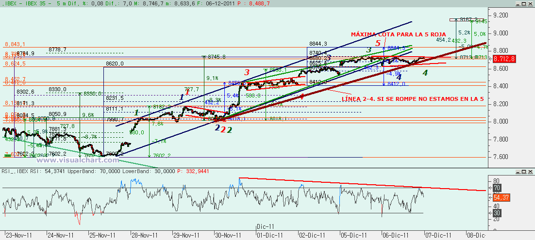 Mañana, por tanto, debemos ver si rompemos por arriba y buscamos una 5 o si nos giramos y confirmamos que hemos terminado la 5. Ya no debe quedar mucho para verificarlo, aunque ya hemos dicho que seguramente hasta la cumbre europea no podamos ver una corrección profunda. De momento ya hemos tenido hoy nuevos rumores por parte de la prensa británica (Financial Times) de que se estaría considerando permitir que el Fondo Europeo de Estabilidad Financiera (FEEF), valorado en 440.000 millones de euros, continuara funcionando cuando a mediados de 2012 entre en vigor el nuevo Mecanismo Europeo de Estabilidad (MEDE), valorado en 500.000 millones de euros. La medida duplicaría el potencial rescate financiero de la Eurozona y podría ser el rumor que hiciera irnos a buscar la 5. Veremos lo que ocurre.