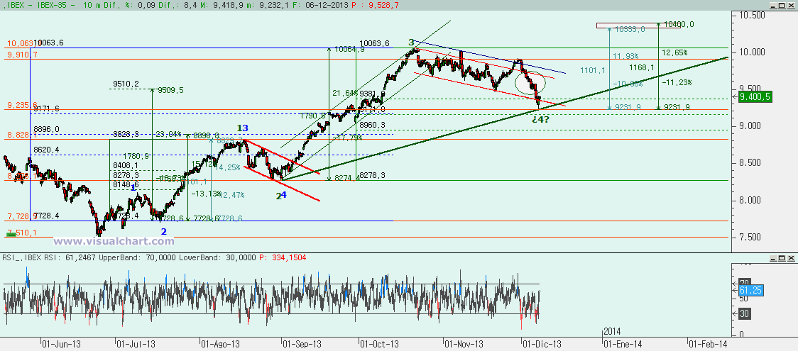 Gráfico desde máximos de finales de noviembre: es evidente que la caída desde esos máximos ha sido o está siendo impulsiva. Si nos damos cuenta, el mínimo del viernes coincide casi al tick con la cota que haría una posible 3 igual al 262% de la 1 o bien un conjunto 3-5 igual al 262% de la 1. Como tenemos, pues, la duda de si hemos acabado la 5 o bien lo que hemos hecho es el mínimo de la 3, vamos a ver hasta dónde llega el rebote. Si es una 4 no debería ir por encima del 9.441-9.504. Se puede pensar en que pueda haber fallo bajista y que la 4 suba más y luego el fallo en la 5, pero no es normal que en una 3 tan extendida luego se produzca eso. Por ello nos vamos a fijar en ese rango. También hemos trazado una posible 2-4 bajista por si hubiera acabado la 5 y si se rompe rápido y sin concesiones, sería una gran señal para los alcistas.