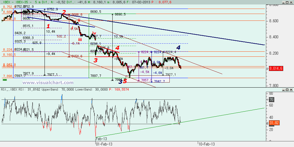 - El rebote ha sido una 4 y ha terminado ya en el máximo de hoy. Se ha formado una especie de murciélago y hay que caer para hacer la 5 bajista. Para que este recuento sea bueno hay que respetar la 2-4 y hacer un nuevo mínimo. El objetivo para la 5 debería estar entre el 7.780 y el 7.864.