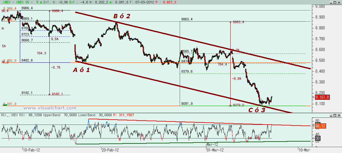 Si miramos el gráfico desde máximos de febrero vemos un perfecto canal bajista cuya parte baja hemos tocado en el mínimo de hoy, justo además cuando se cumplía que este segundo tramo bajista era igual al 162% del primero. Entonces habríamos podido hacer una A ó 1 el día 16 de febrero, luego un rebote para hacer la B ó 2 y alcanzar casi el 80% de la A ó 1 y ahora una C ó 3 igual al 162% de la A ó 1. El recuento intermedio de estas ondas no es tan claro como nos gustaría, por lo que desconfiamos un poco, pero como encajan las piezas vamos a tenerlo en cuenta. Entonces ahora se trataría de ver si estamos en una 4 o si hemos terminado una ABC. Para que sea esto una 4 deberíamos ver un rebote que no debería llegar más allá de la zona del 8.379-8.482, siendo esta última cota la clave porque es el mínimo de la posible 1.