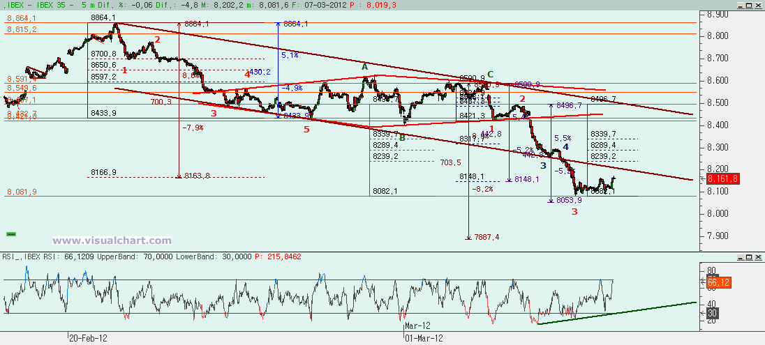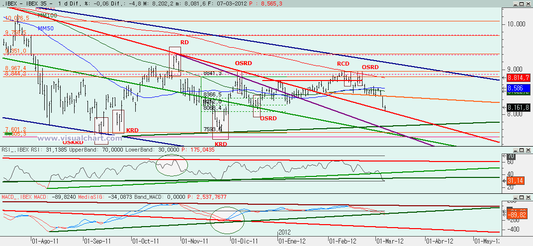 Miércoles 07 de Marzo de 2012: Jornada con un nuevo mínimo con respecto a la sesión de ayer, pero en la que al final se han salvado los muebles cerrando casi planos. La llegada a zona de soporte en los 8.120 han logrado parar la caída, pero la pregunta es si esto es un parón para seguir bajando o si vamos a ver un rebote más sólido aquí. Veamos lo que nos dicen los gráficos y si somos capaces de interpretarlos correctamente.