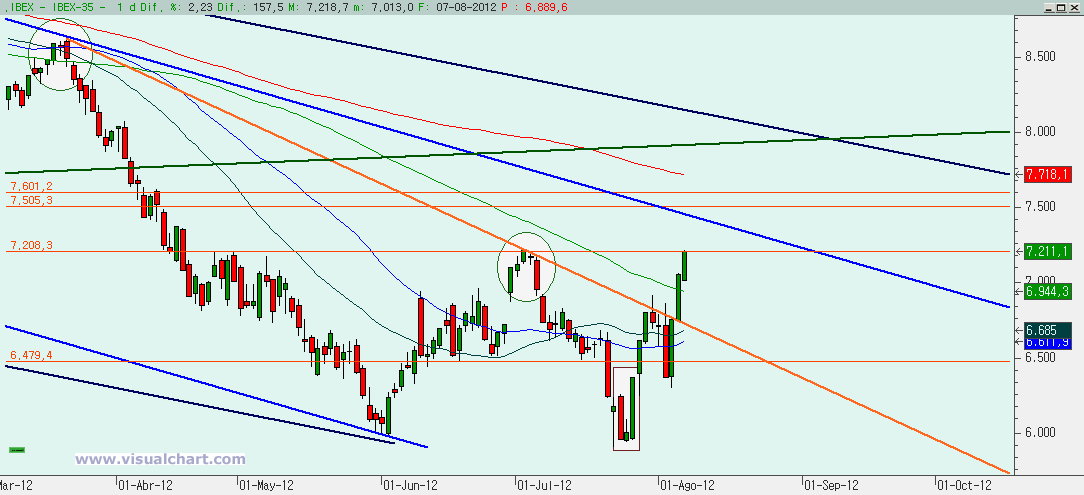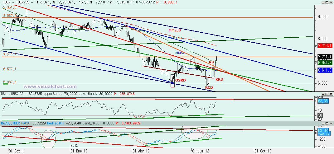 Martes 07 de Agosto de 2012: Continuamos con el rebote iniciado días atrás. Cada día parece más pesado, pero no hay fuerzas para bajar, ni siquiera para corregir, porque hoy tras la subida inicial hemos intentado corregir, pero al mínimo contacto con el color rojo hemos vuelto a subir a zona de máximos. Por tanto, veamos lo que nos dicen los gráficos para ver hasta dónde puede llegar esta subida.