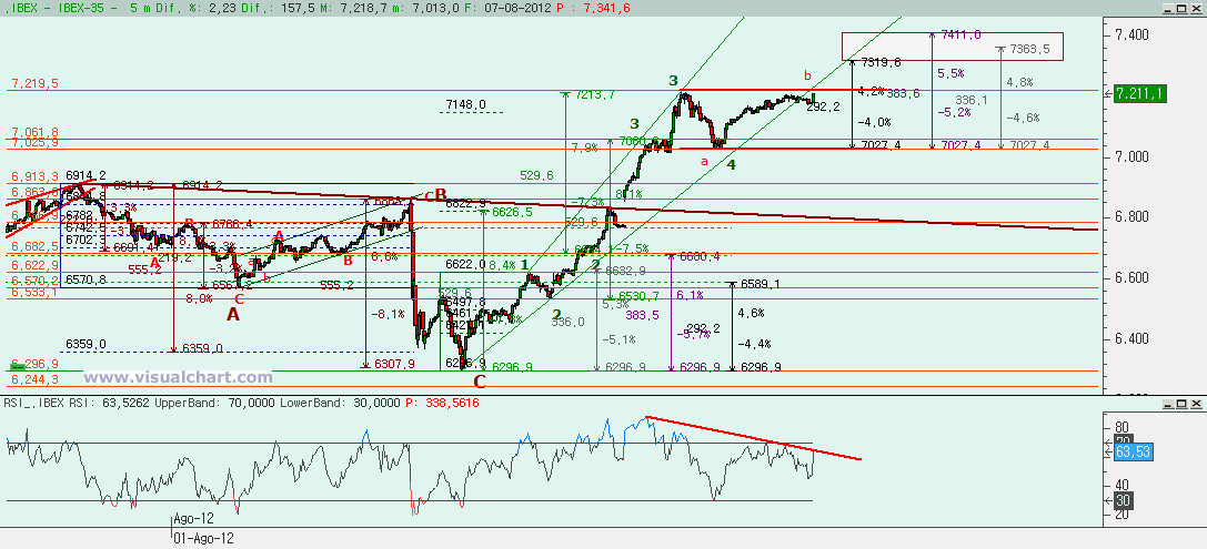 Mirando el recuento desde mínimos del viernes, ayer pusimos una opción de que el máximo de ayer pudiera ser la 3 para ser igual al 162% de la que marcamos como 1. El que hoy hayamos superado esa zona con una pequeñísima corrección podría decirnos que si la 3 terminó donde dijimos ayer, la 4 habría sido una plana con B fuerte que habría acabado en el mínimo de hoy y desde ahí haber comenzado la 5. Si así fuera, el objetivo para la 5 podría estar entre el 7.319 y el 7.411. Pero otra opción sería que la 2 no terminara donde pusimos ayer, sino que hubiera sido una plana continua que hubiera terminado más arriba. Eso nos daría un objetivo para la 3 en el máximo de hoy y desde ahí estar haciendo una 4. Esa 4 podríamos estar haciéndola o bien como una plana común, con lo que mañana deberíamos hacer una C bajista, como un triángulo, con lo que quedaría por hacer la c, d y e antes de comenzar la 5 o bien como un canal rectángulo, por lo que el objetivo al final para la 5 sería el mismo que hemos puesto antes. Esto habrá que verlo mañana y lo iremos señalando según vaya sucediendo.