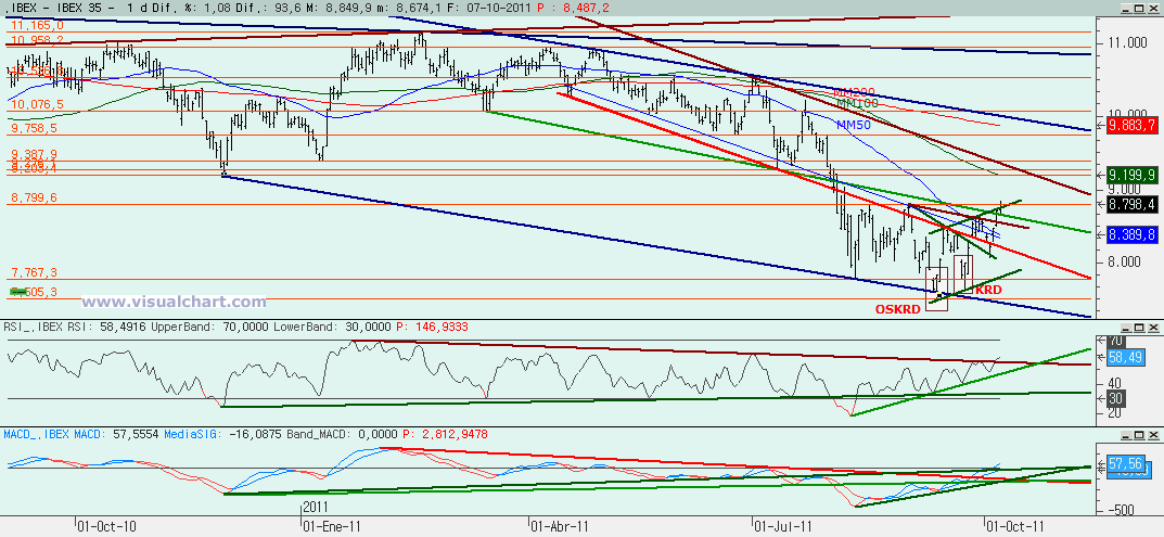 Domingo 09 de Octubre de 2011: Nueva jornada alcista en el Ibex para concluir la semana y continuar con el rebote iniciado desde mínimos del martes. El canal alcista desde mínimos de septiembre se mantiene y estamos cerca de intentar romperlo por arriba, lo que daría una nueva dimensión al rebote. Tras superar las zonas de bajistas y la MM50 del gráfico diario días atrás, nos encontramos con la resistencia de los 8.800 como última oposición antes de ir a buscar la MM100. Veamos todo esto en los gráficos.