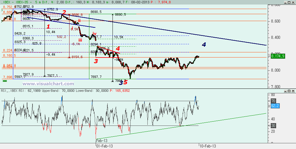 Volvemos con el gráfico desde máximos de enero. La duda era si se habían hecho 5 bajistas completas y este rebote era una correción a esas 5 bajistas o si habíamos hecho solo 3 y este rebote era una 4. Y dijimos que mientras no se superara la zona del 8.200-8.294 podría ser esto una 4. Esa zona no la hemos superado aún, por lo que la duda permanece. Entonces habrá que empezar a mirar el espacio temporal y vemos que si fuera una 4 ya estaríamos en el mismo tiempo que habría tardado la 3. Es posible que pueda ir incluso algo más allá en el tiempo, pero si vemos que esto se prolonga y dura más el que conjunto de las posibles ondas 1, 2 y 3 conjuntos, habrá que pensar en que no es una 4, aunque no se llegue a superar el 8.200-8.294. Lo que está claro es que el que habíamos marcado como máximo de una posible 4 el jueves no era tal, y habría que esperar a que terminara para volver a trazar una 2-4. Siempre y cuando esto sea una 4, claro está. Recordemos que si esto es una 4, el objetivo para la 5 debería estar entre 326 y 281 puntos desde que acabara la 4.
